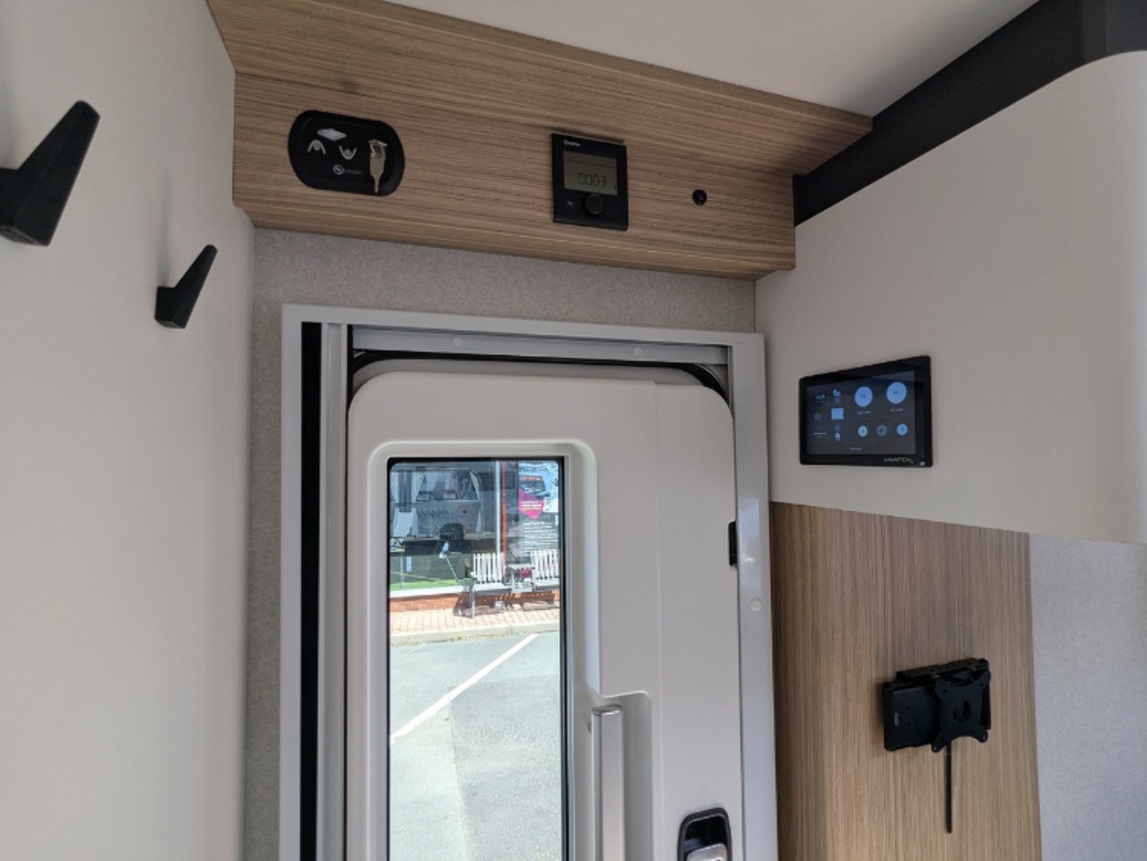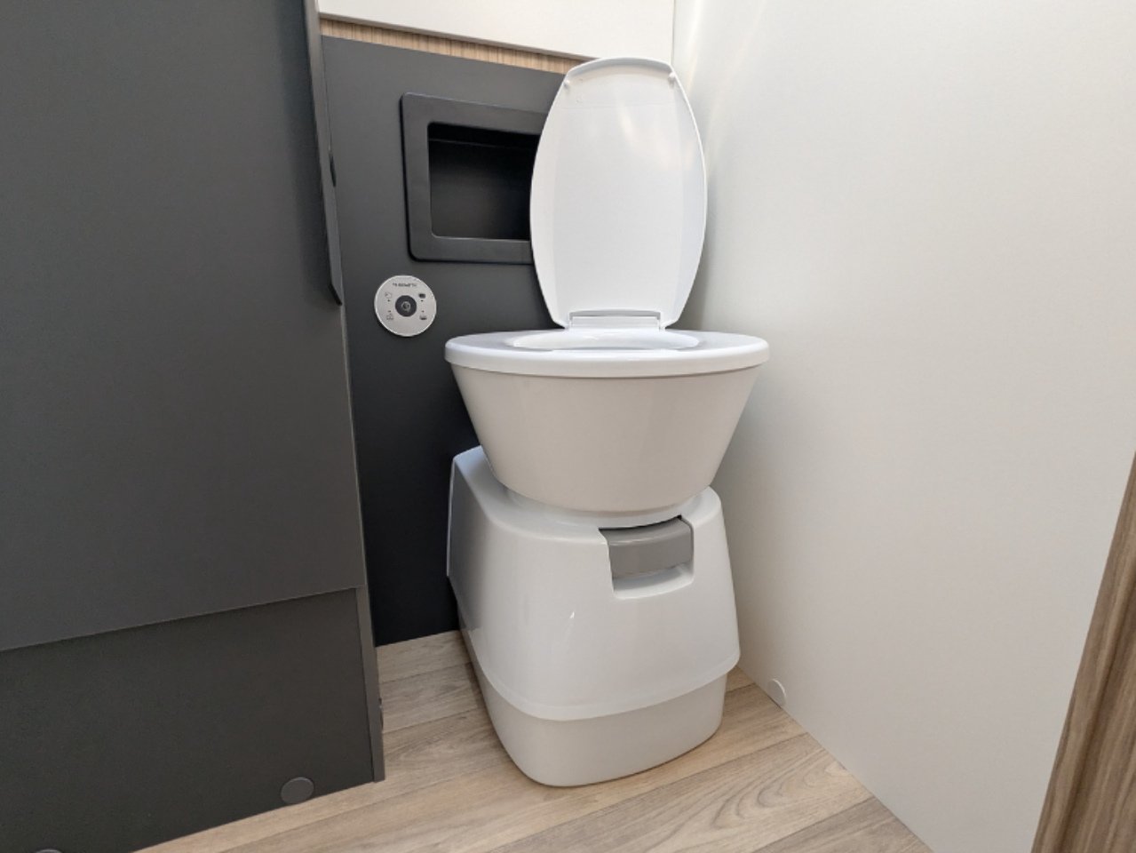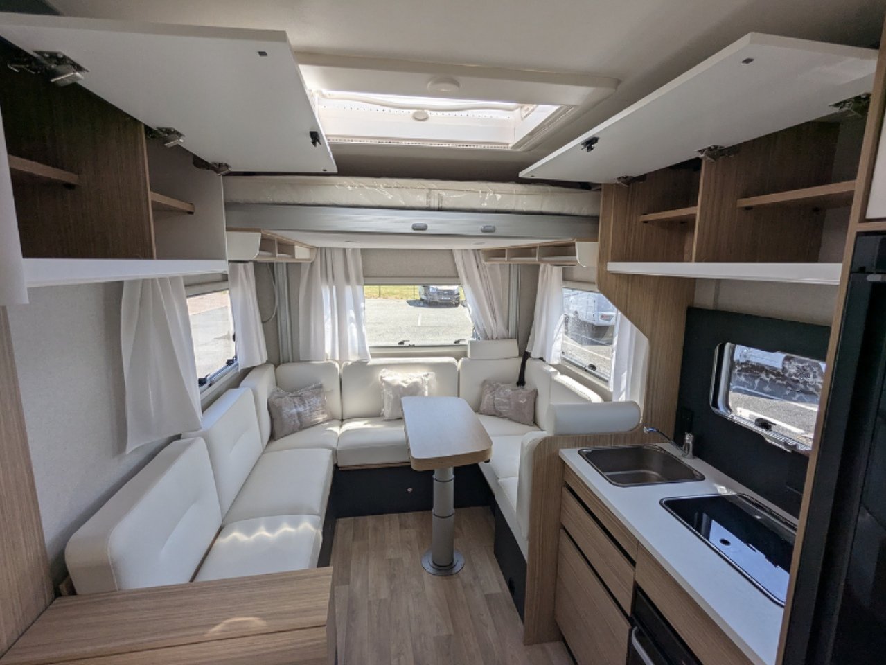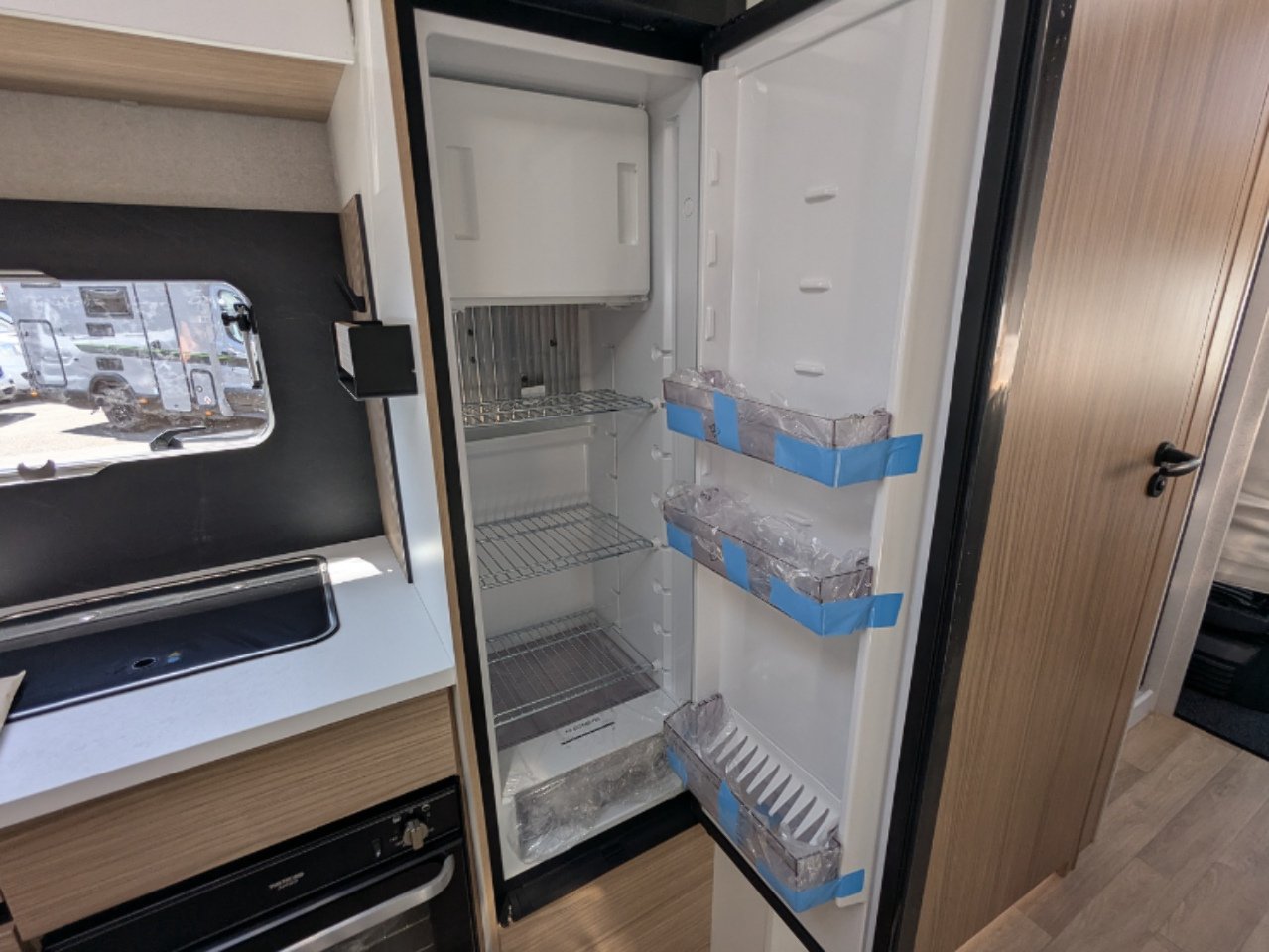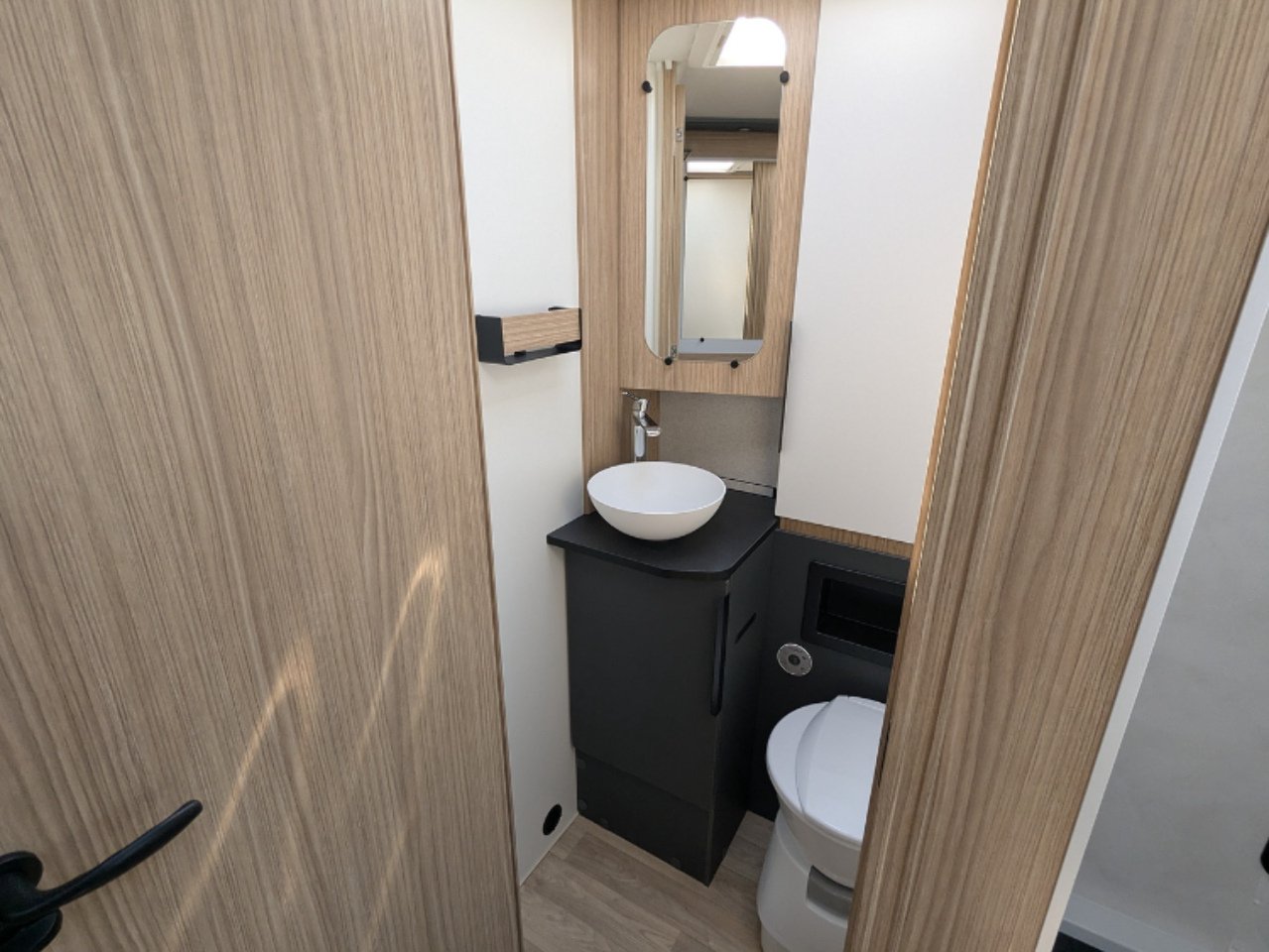 The sleeping area consists of a large XXL drop-down bed 160x200cm. Well thought out, the placement of the TV arm allows you to watch it from the comfort of your bed. A bed in the living room can accommodate 2 additional traveller’s since the P696U is also equipped for 4 vehicle registration seats.