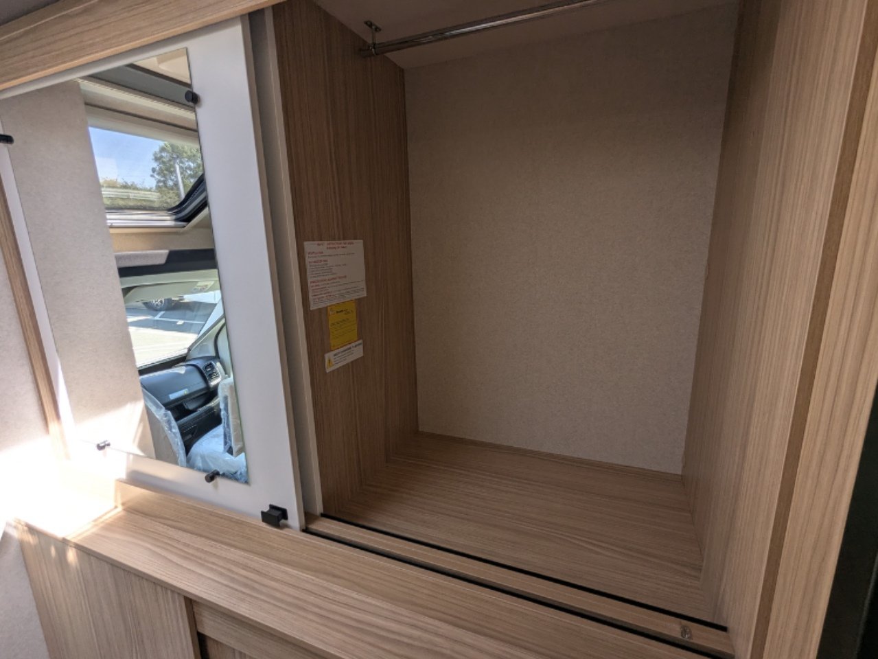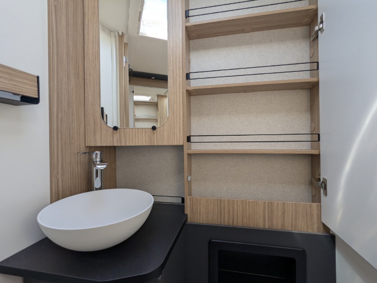 The walk-in wardrobe, located between the cabin and the lounge, is ideal for storing your clothes and belongings. Equipped with a large mirror, it also has a wardrobe and various drawers directly accessible from the shower room, for added practicality. Access to the cargo area is just below the dressing room.