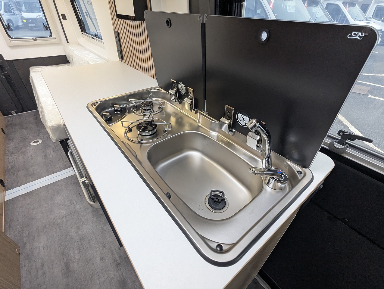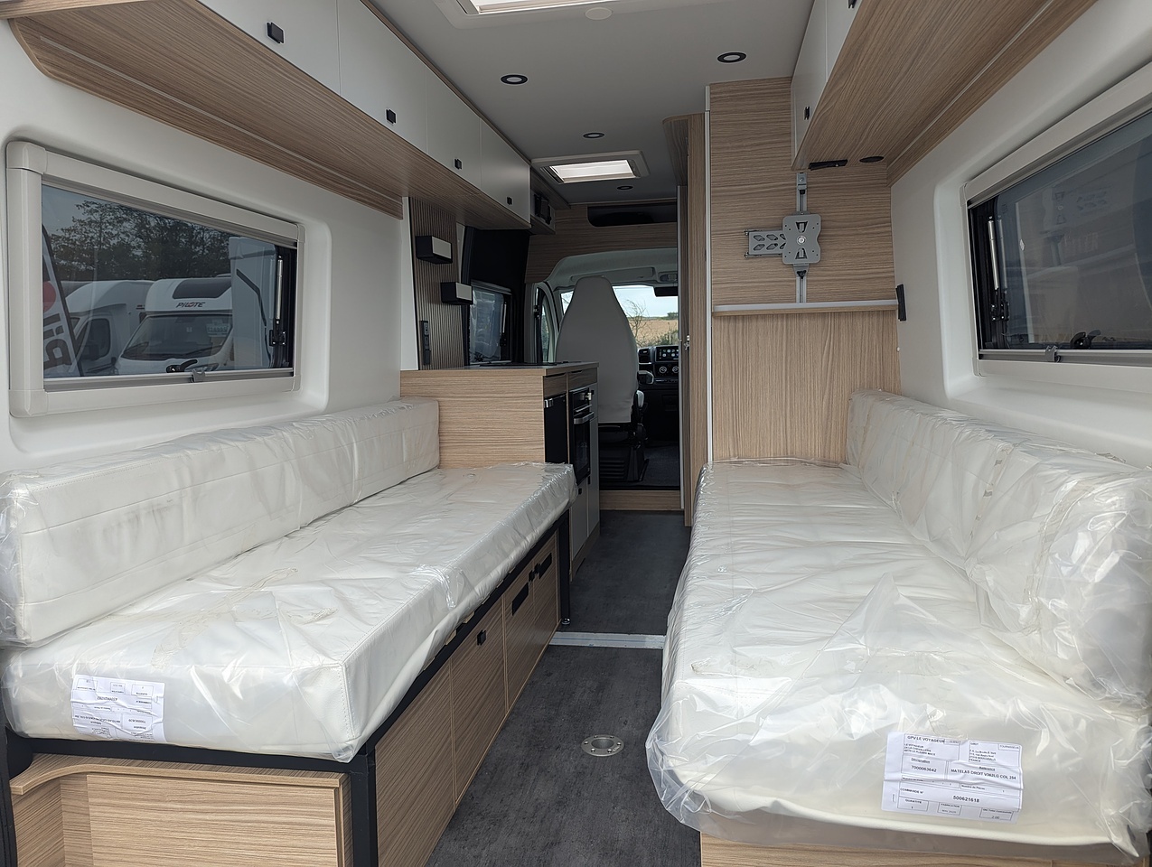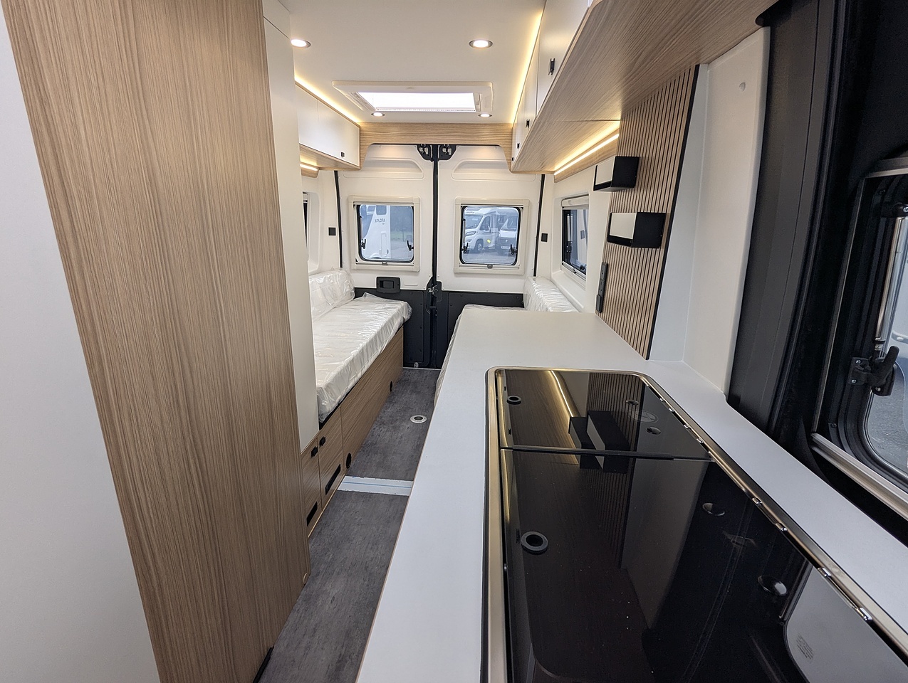 Designed to comfortably accommodate 2 people, the V630Lg features a cozy rear lounge that converts into a sleeping area. The interior is crafted with high quality materials, offering a modern and inviting atmosphere.