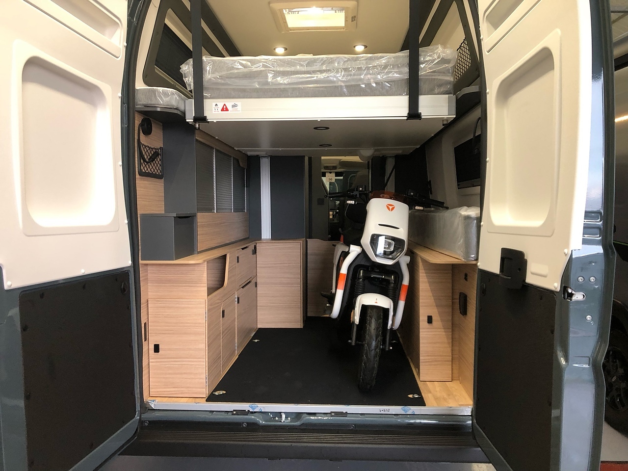 The V633M panel van is the tallest and most flexible van from the Pilote brand. You will appreciate its functional kitchen divided into 5 drawers with integrated waste bin. The practical and ergonomic 3-in-1 bathroom gives you space to move. Its electric drop-down bed offers a pleasant space for sleeping. The maximum cargo hold capacity that will allow you to store everything you need, even a motorcycle.