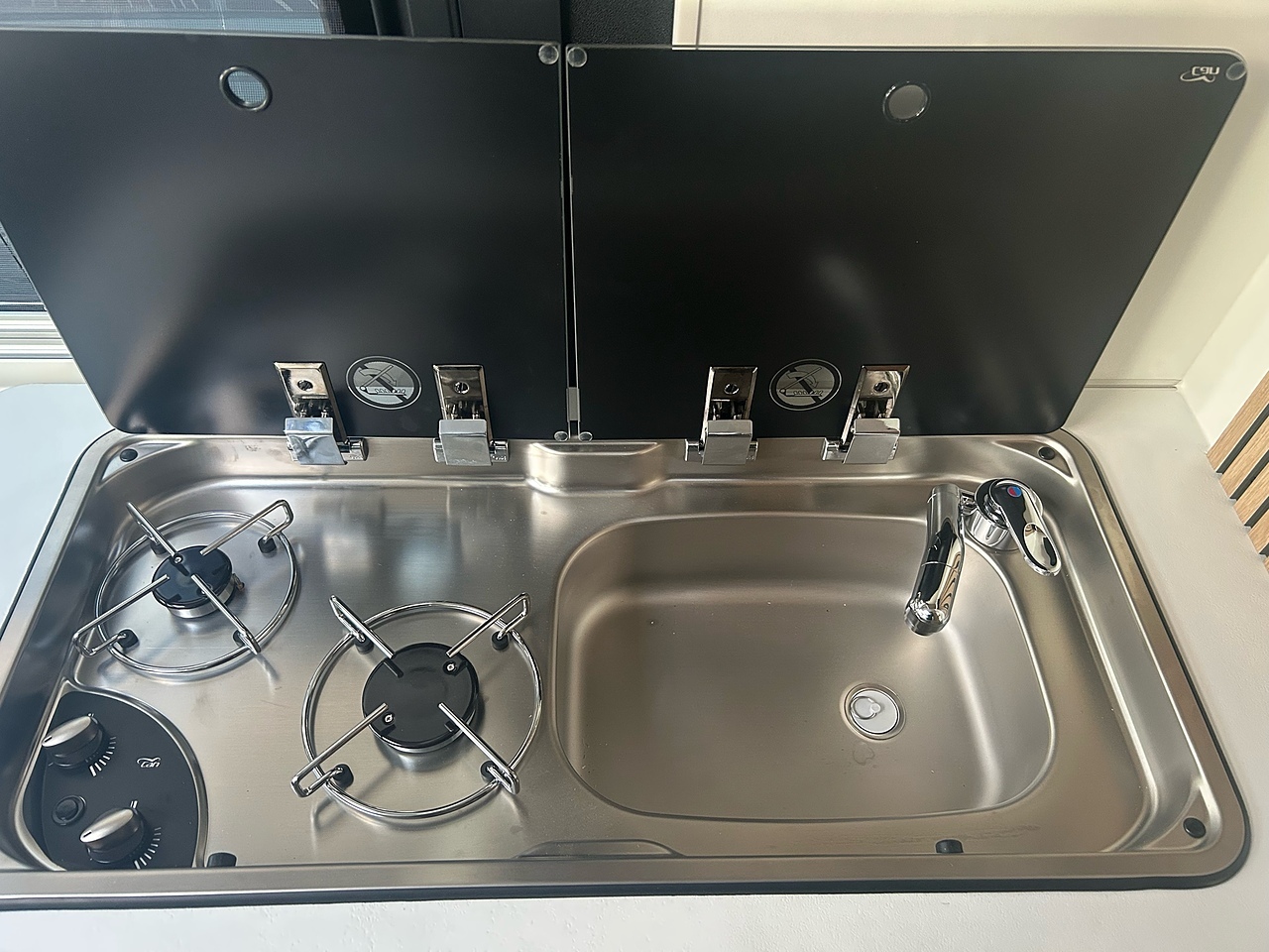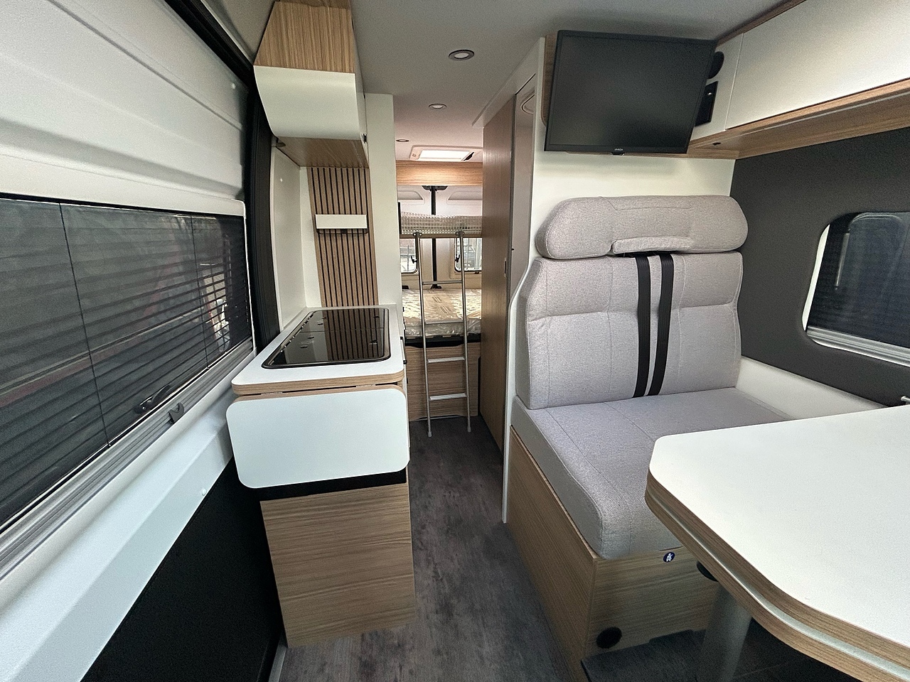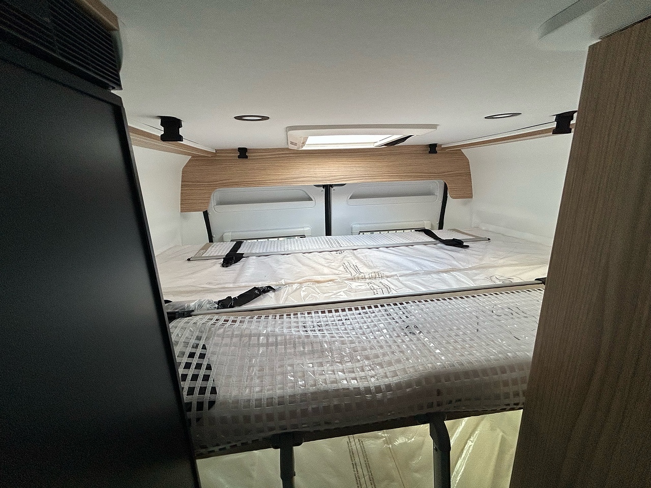 Above the traditional transverse double bed at the rear there is a second double bunk allowing 4 people to sleep in this 6m long vehicle.