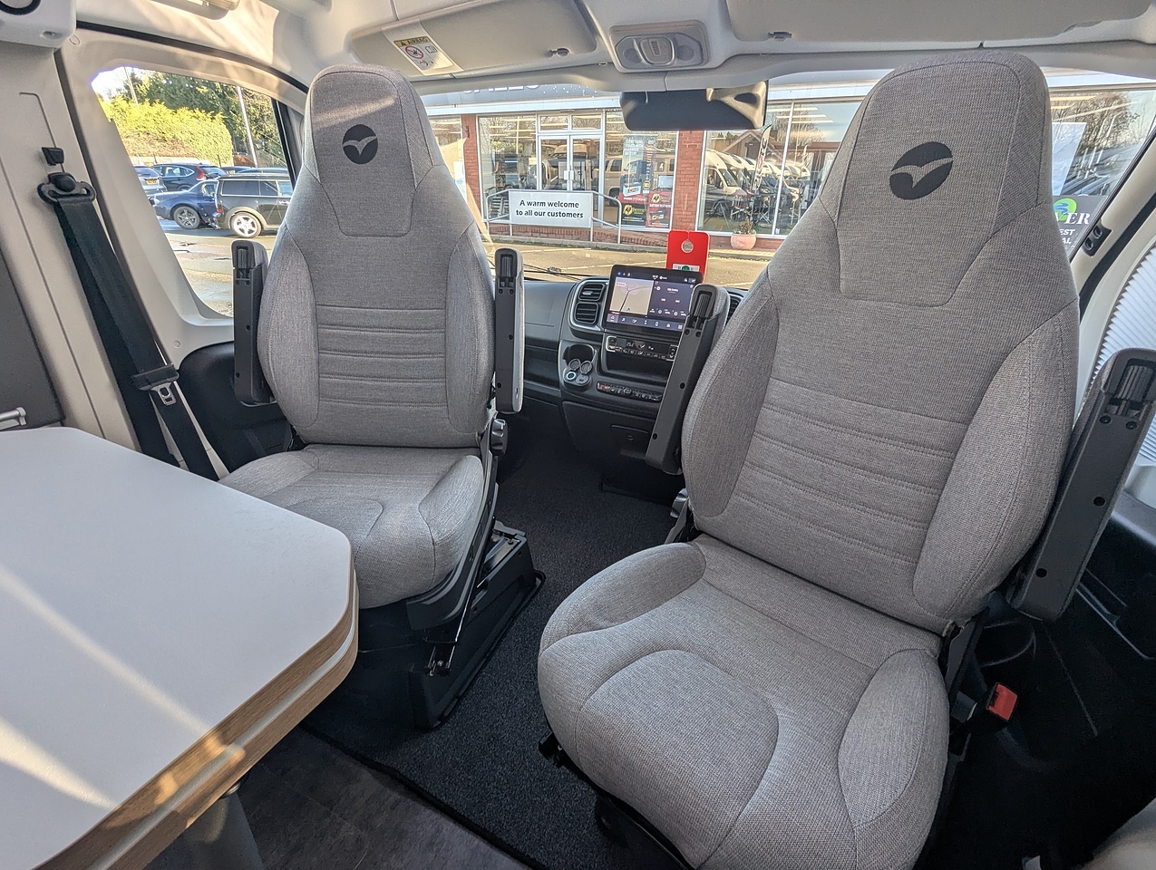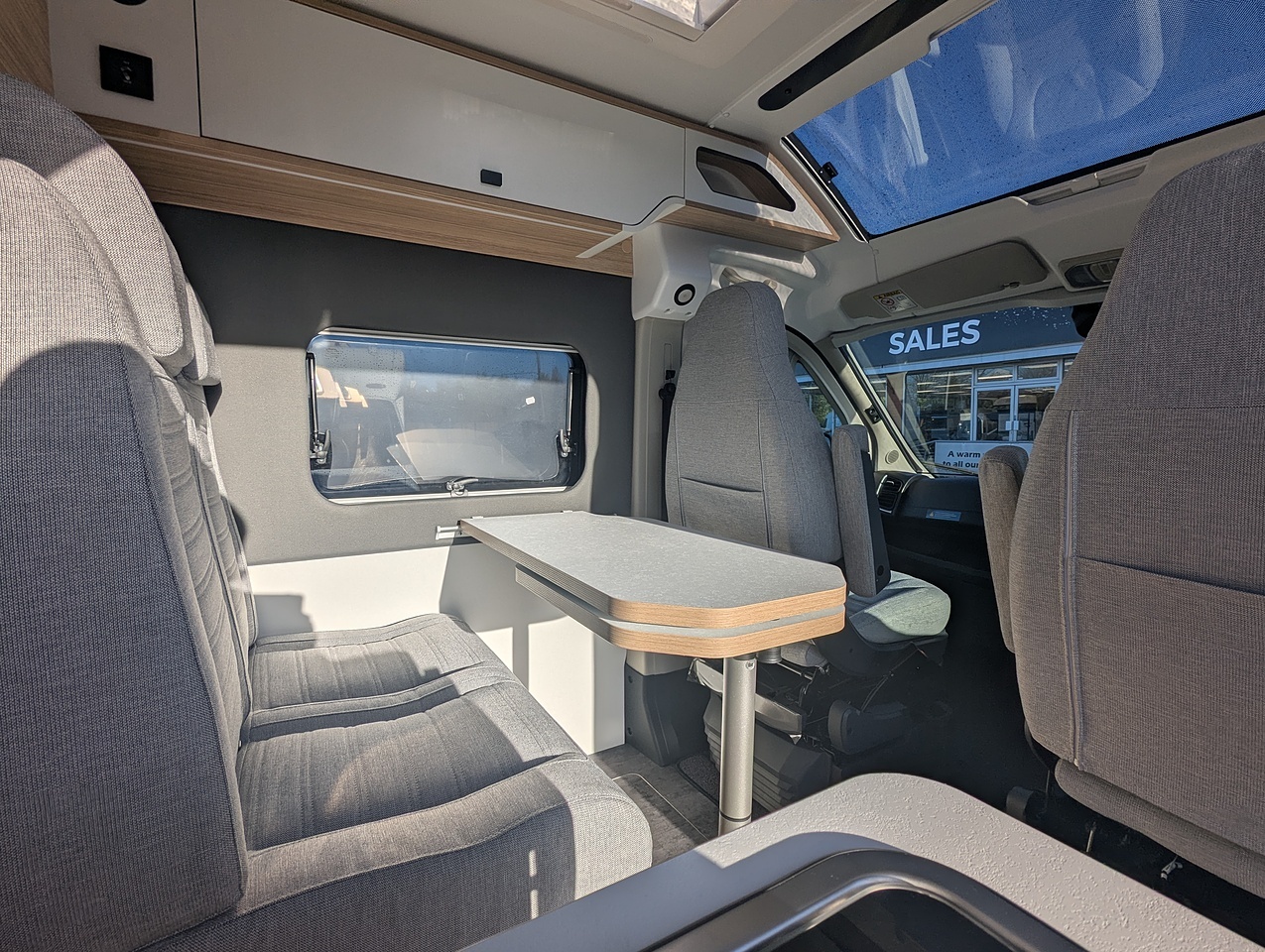 The V630S offers a welcoming, well-designed lounge area, where the swivel cab seats and forward-facing bench create a pleasant space for sharing meals or relaxing with up to four people. The adjustable table adapts to different times of the day, and the large windows provide abundant natural light, enhancing the feeling of space.