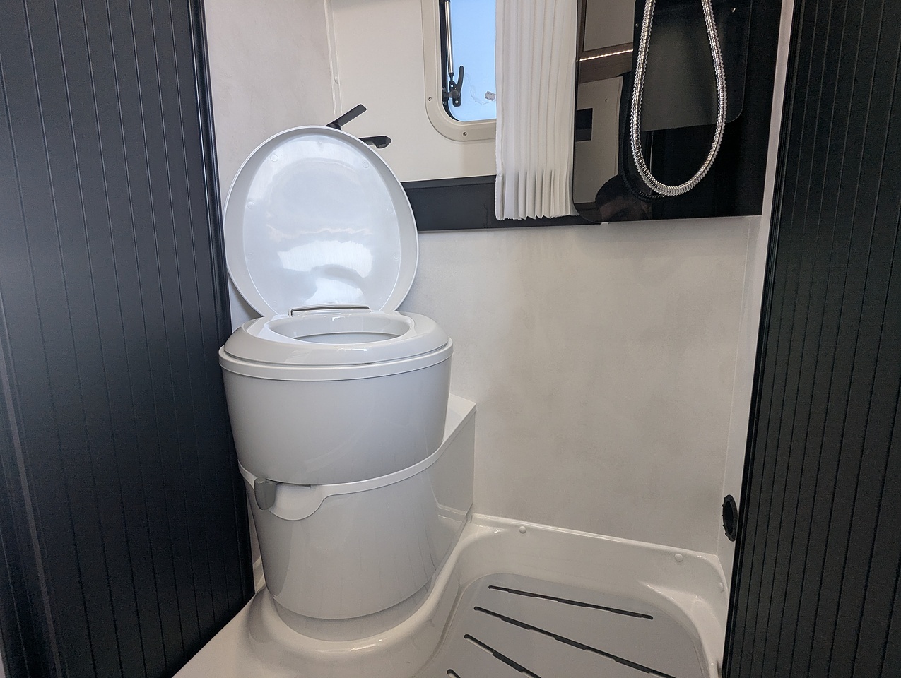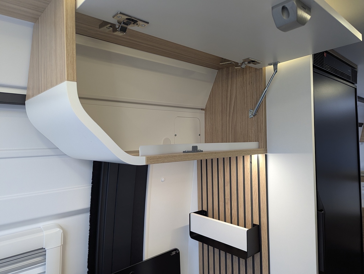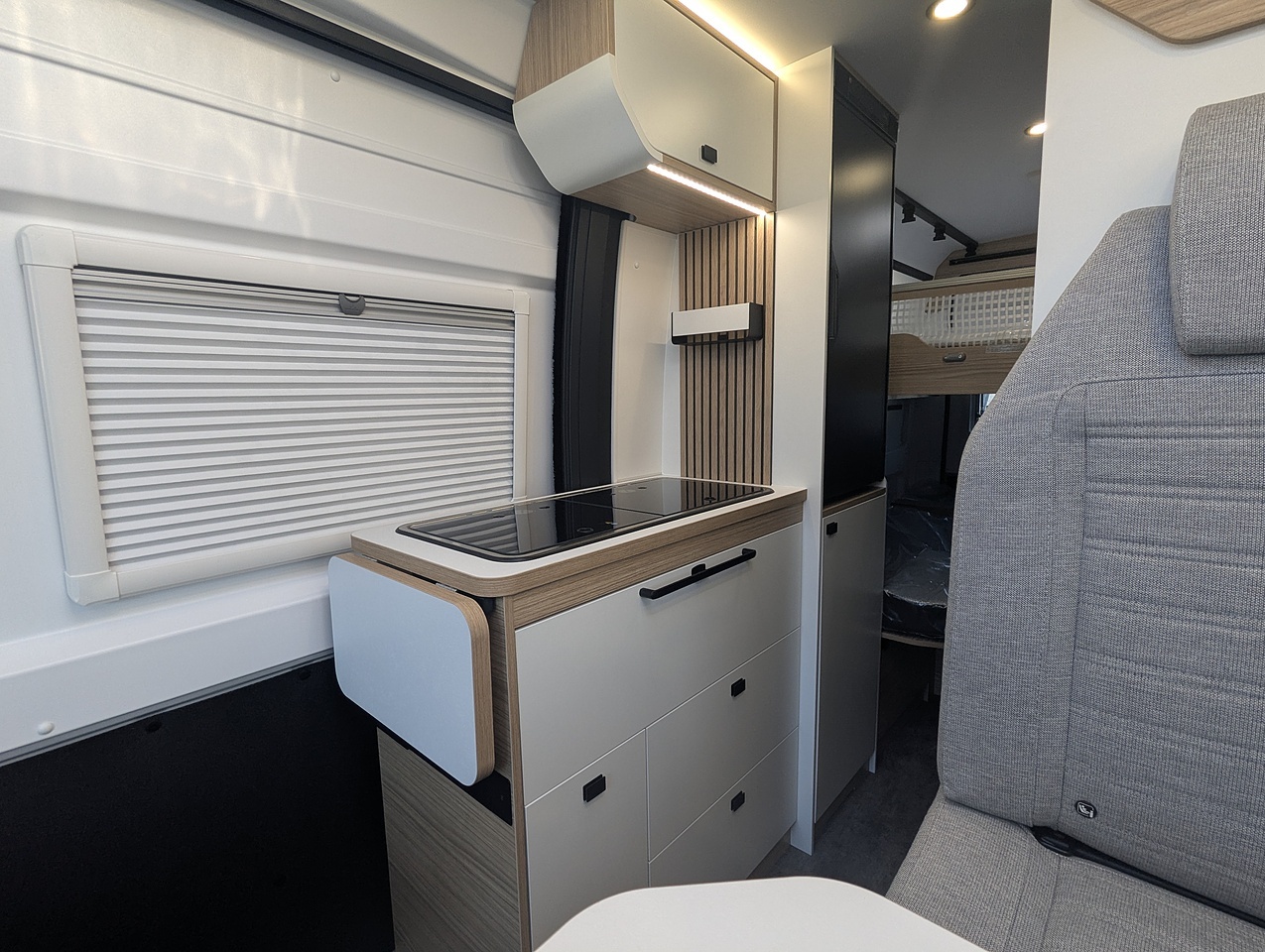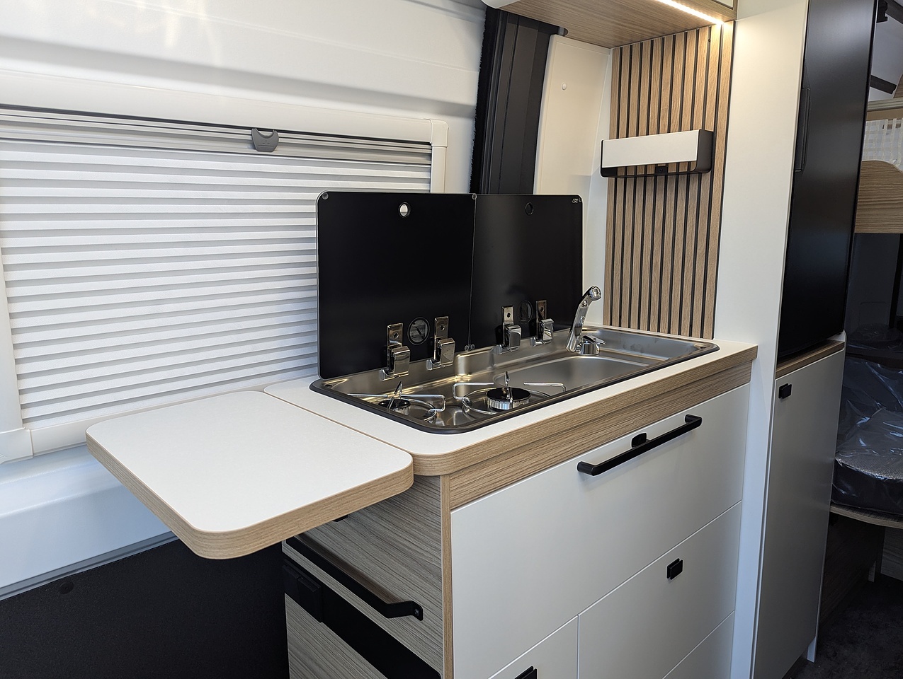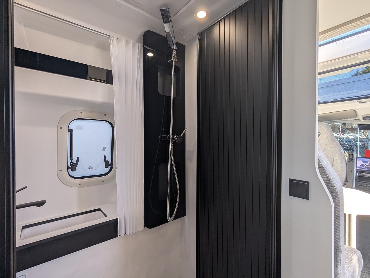 The fully opening bathroom combines a shower, sink, and toilet in an optimized space, with no compromise on comfort. Designed for daily convenience, it ensures a pleasant experience even on longer journeys.