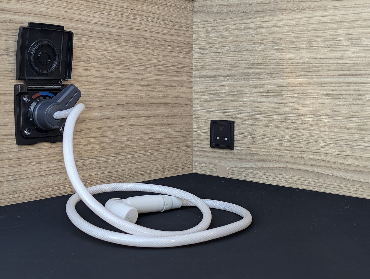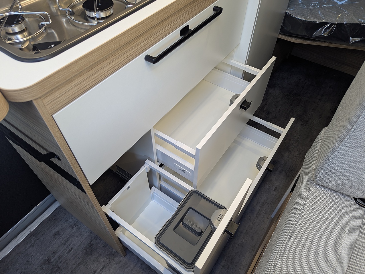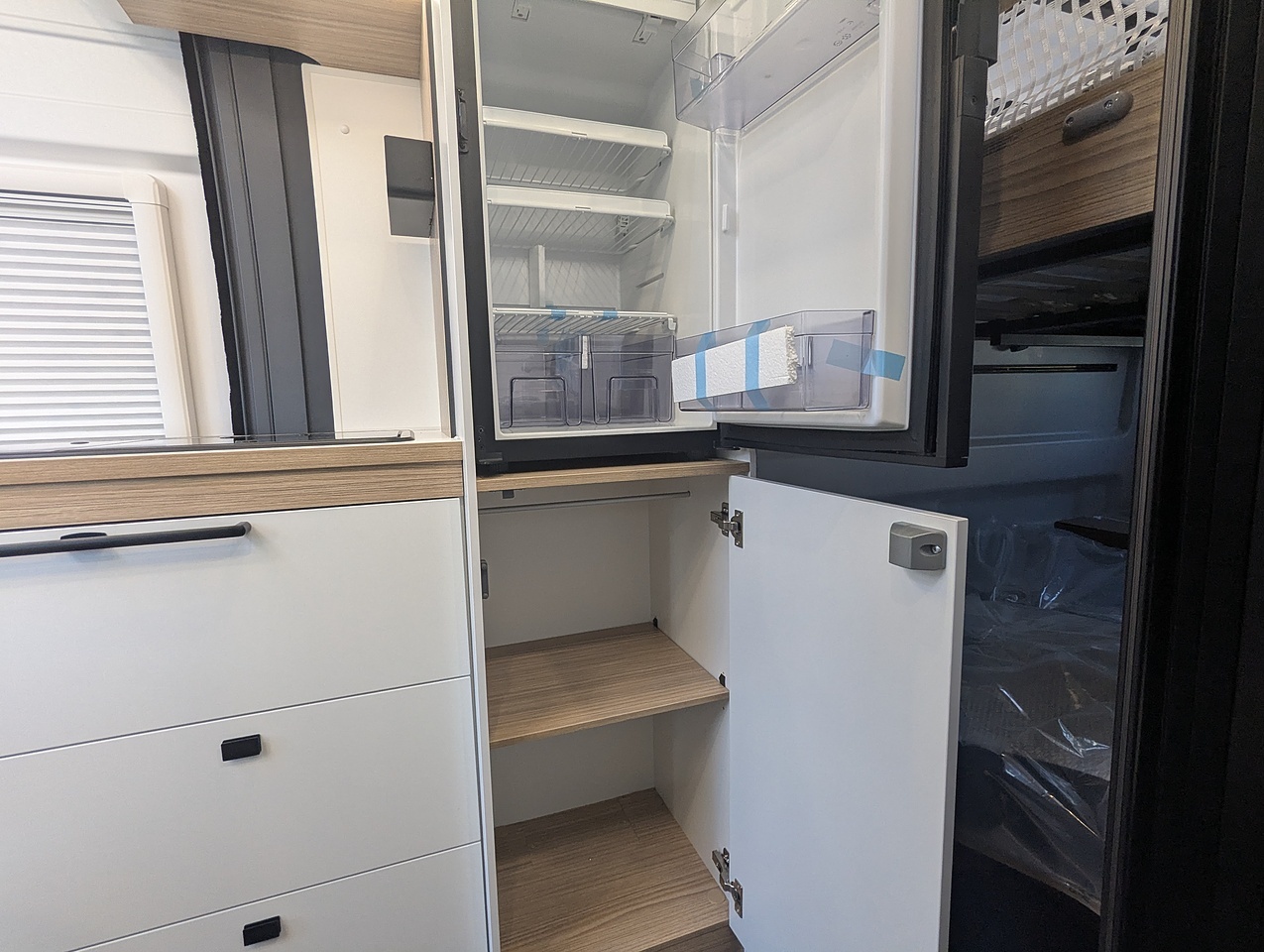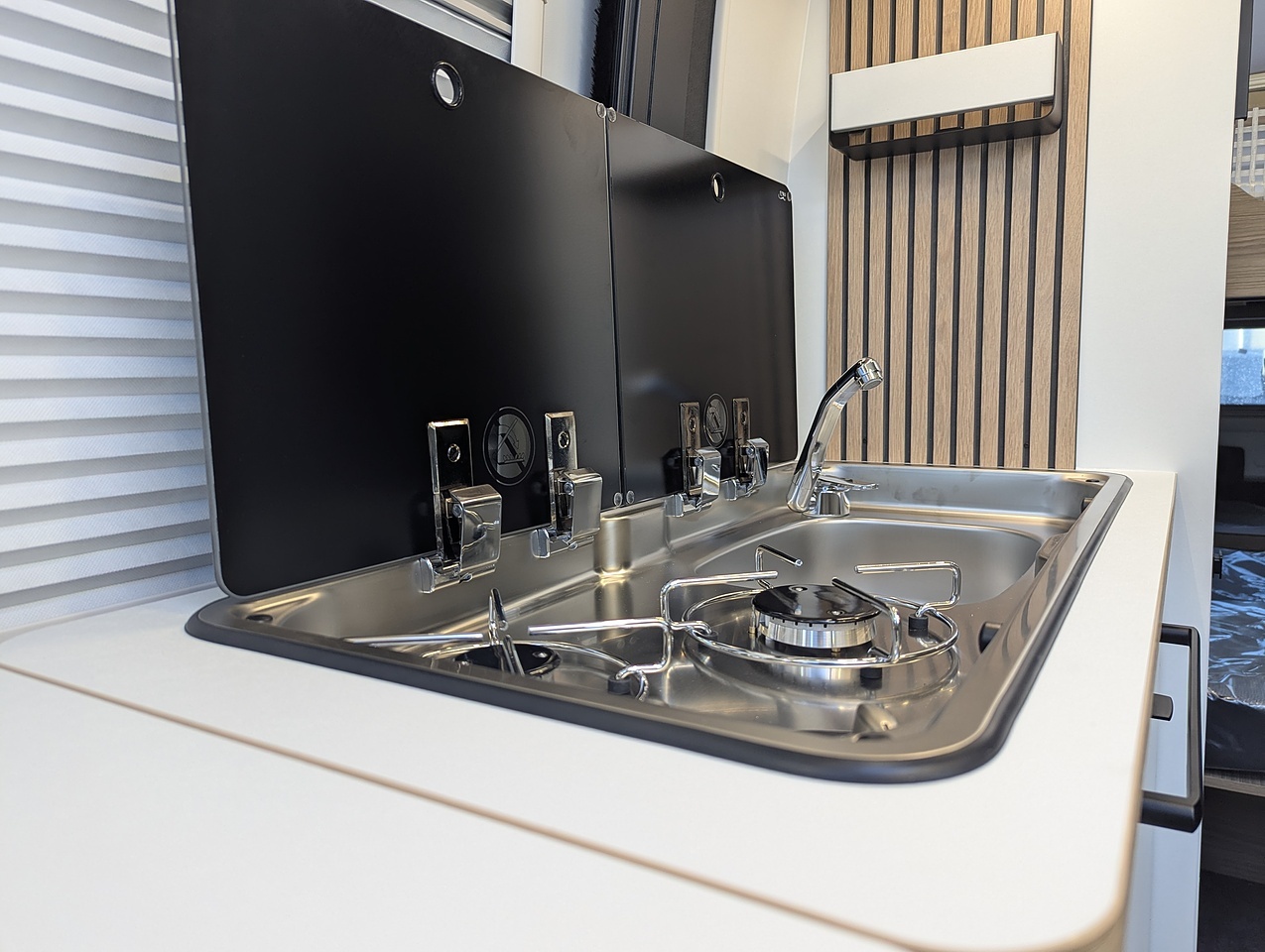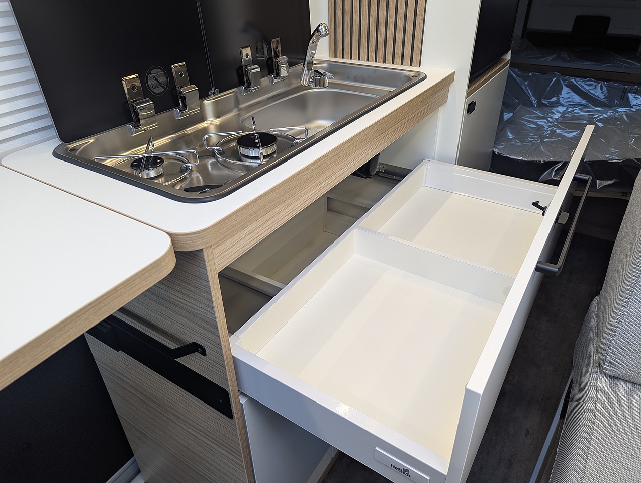 The fully opening bathroom combines a shower, sink, and toilet in an optimized space, with no compromise on comfort. Designed for daily convenience, it ensures a pleasant experience even on longer journeys.