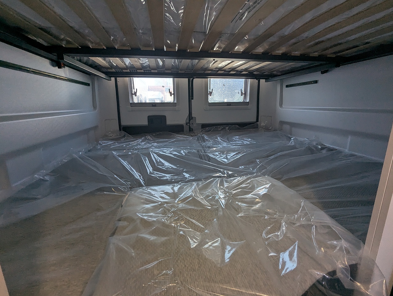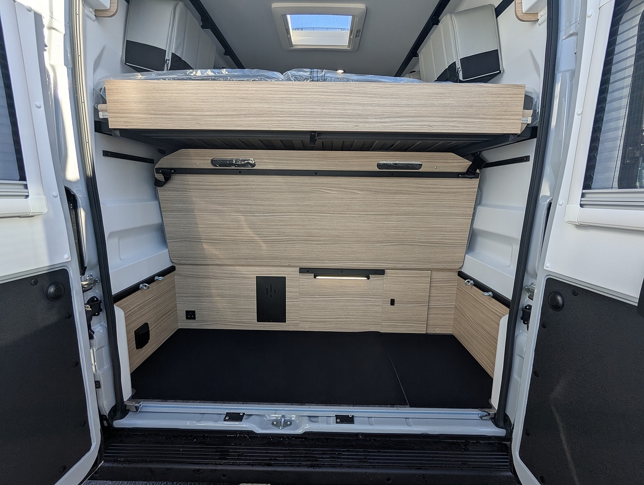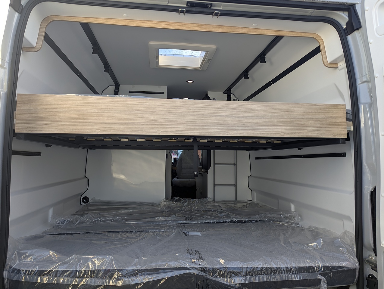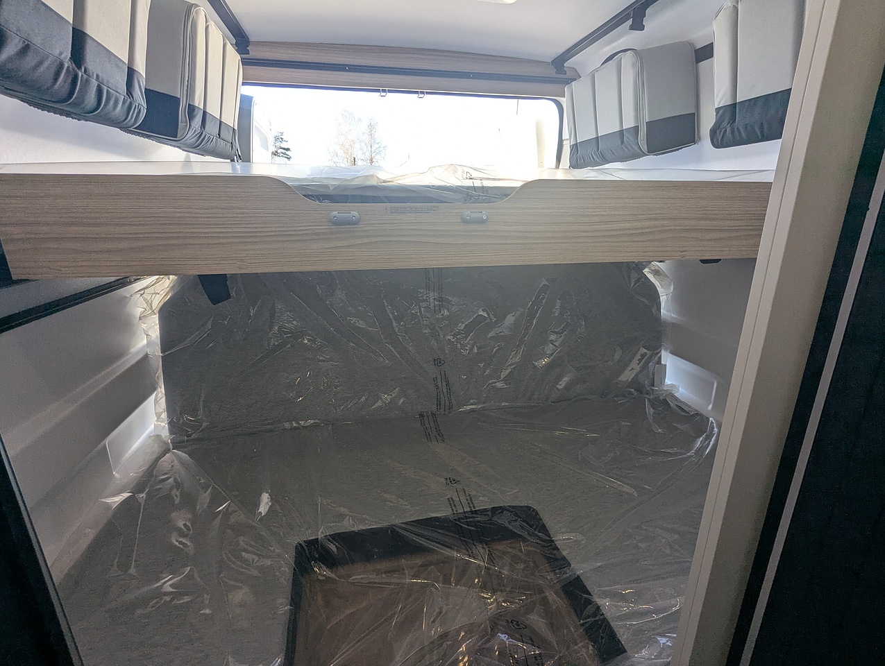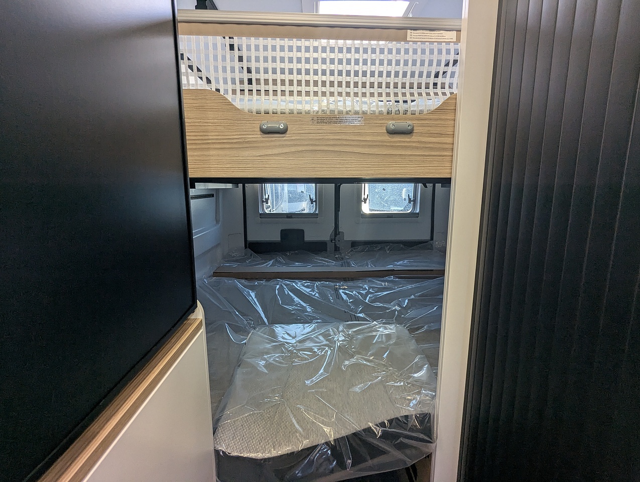 At the rear, the bedroom stands out for its high modularity. The bunk beds can be configured to suit your needs: as twin beds, a double bed, or a single bed with generous storage space underneath. The upper bed, equipped with a slatted bed base and independent mattress, can comfortably accommodate one or two people. An ideal setup for families or travelers seeking flexibility and comfort.