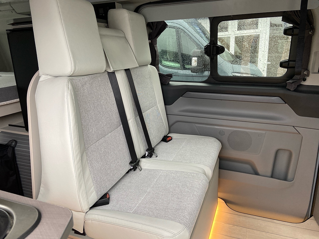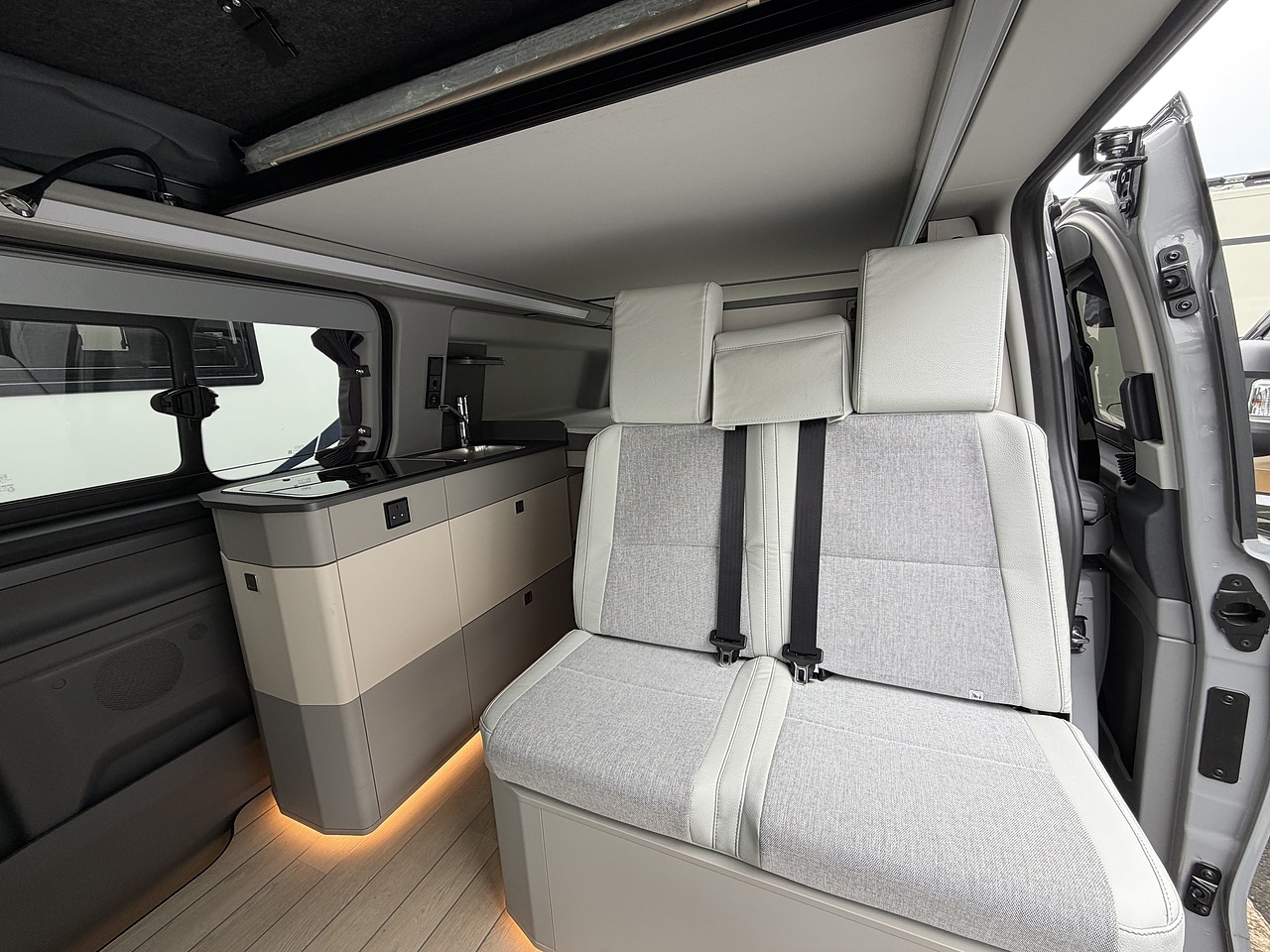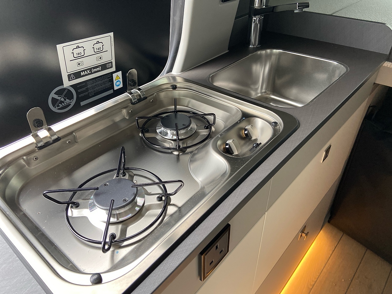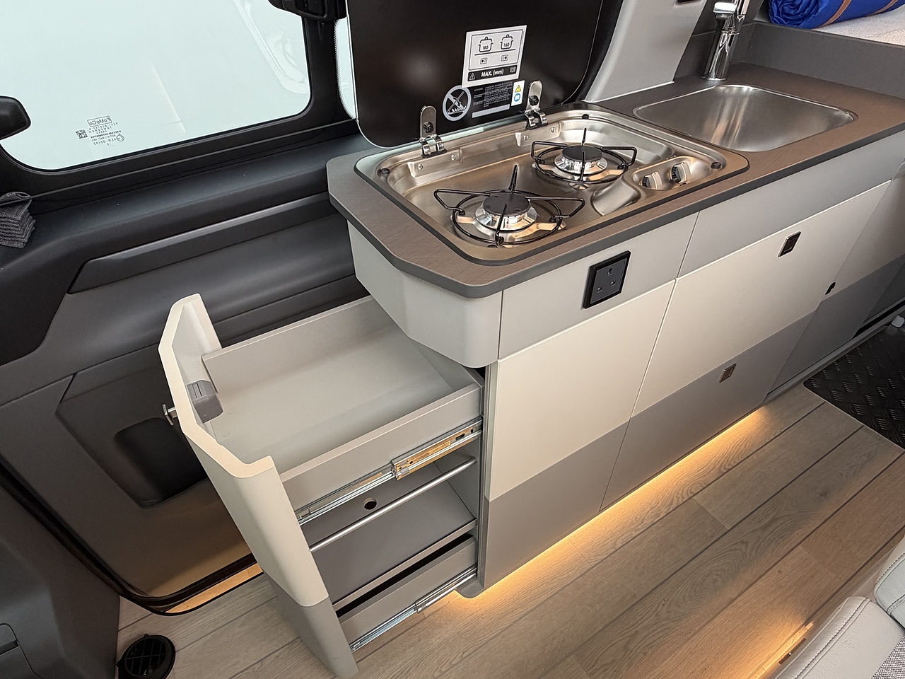 Full Kitchen: The side kitchen unit is equipped with two gas burners, a 51-litre compressor fridge, a sink, and a Truma hot water system.
