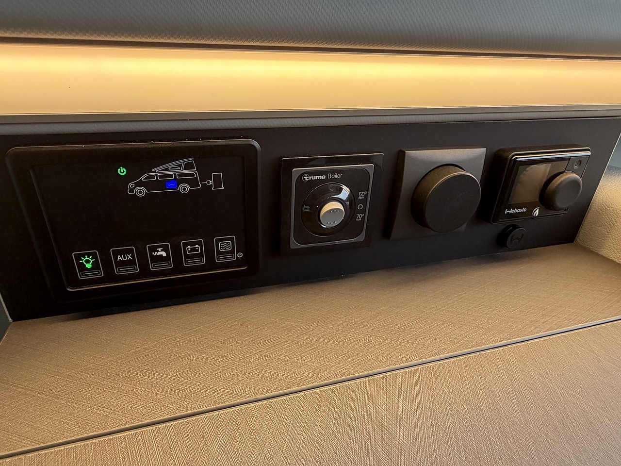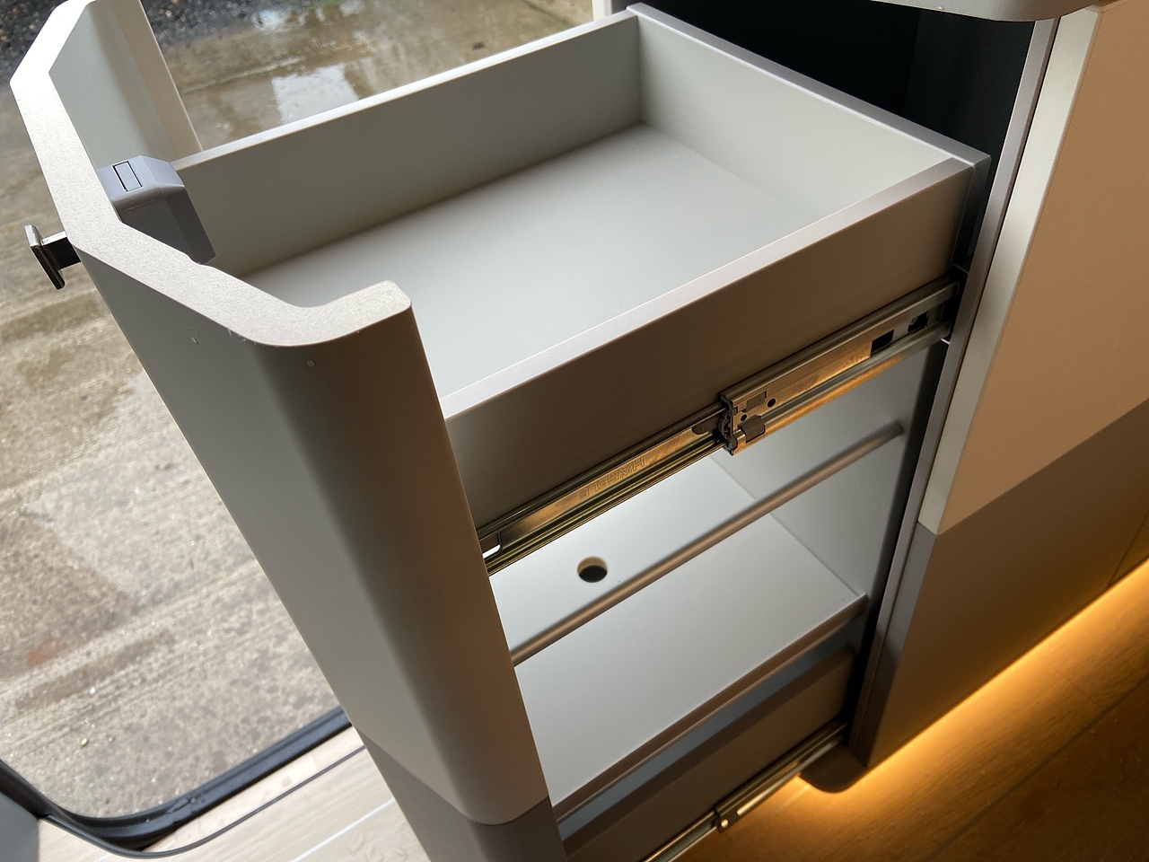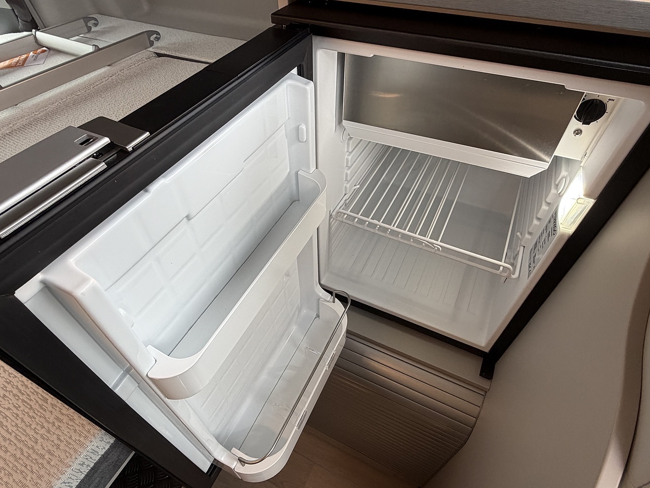 Full Kitchen: The side kitchen unit is equipped with two gas burners, a 51-litre compressor fridge, a sink, and a Truma hot water system.