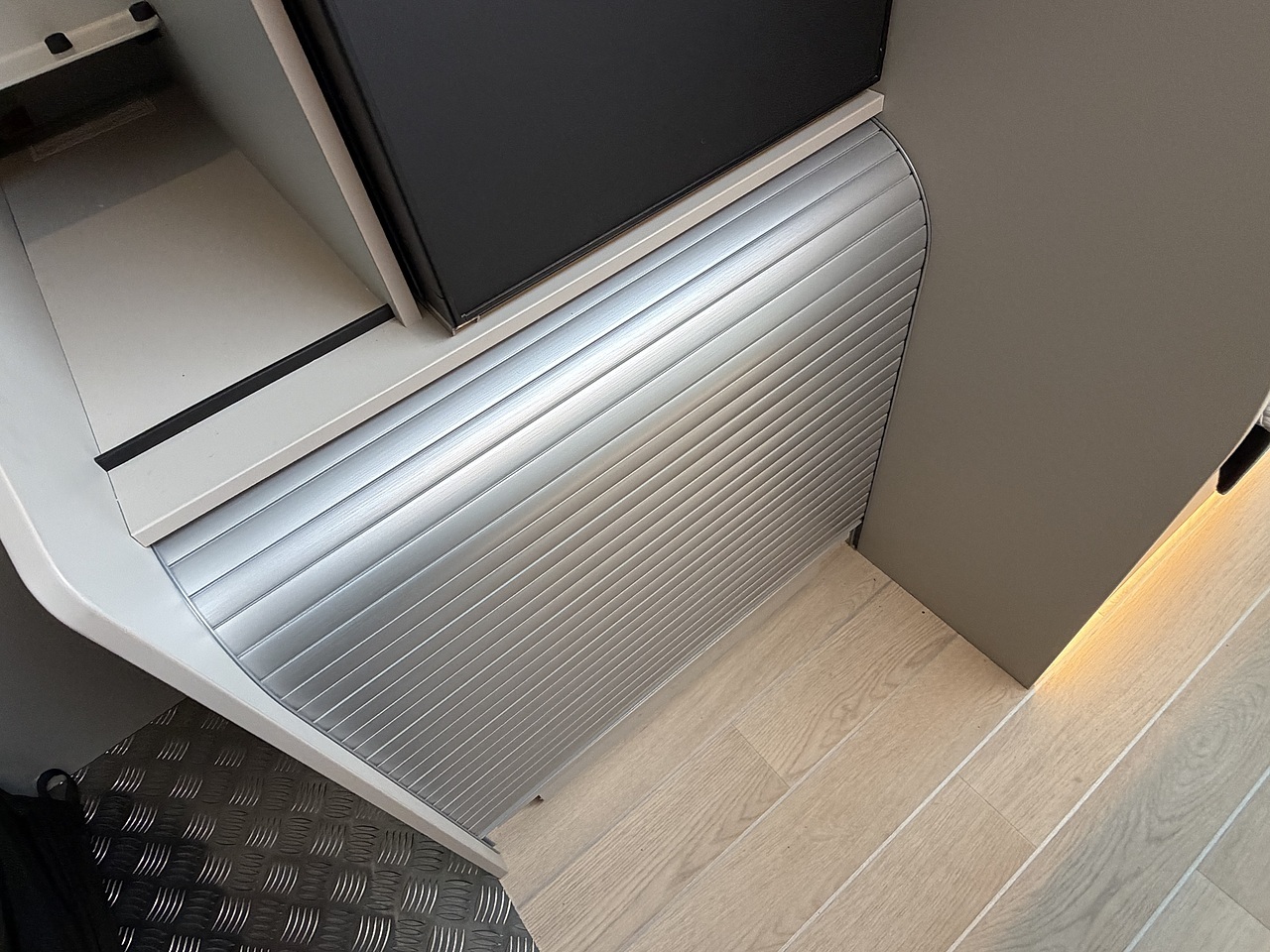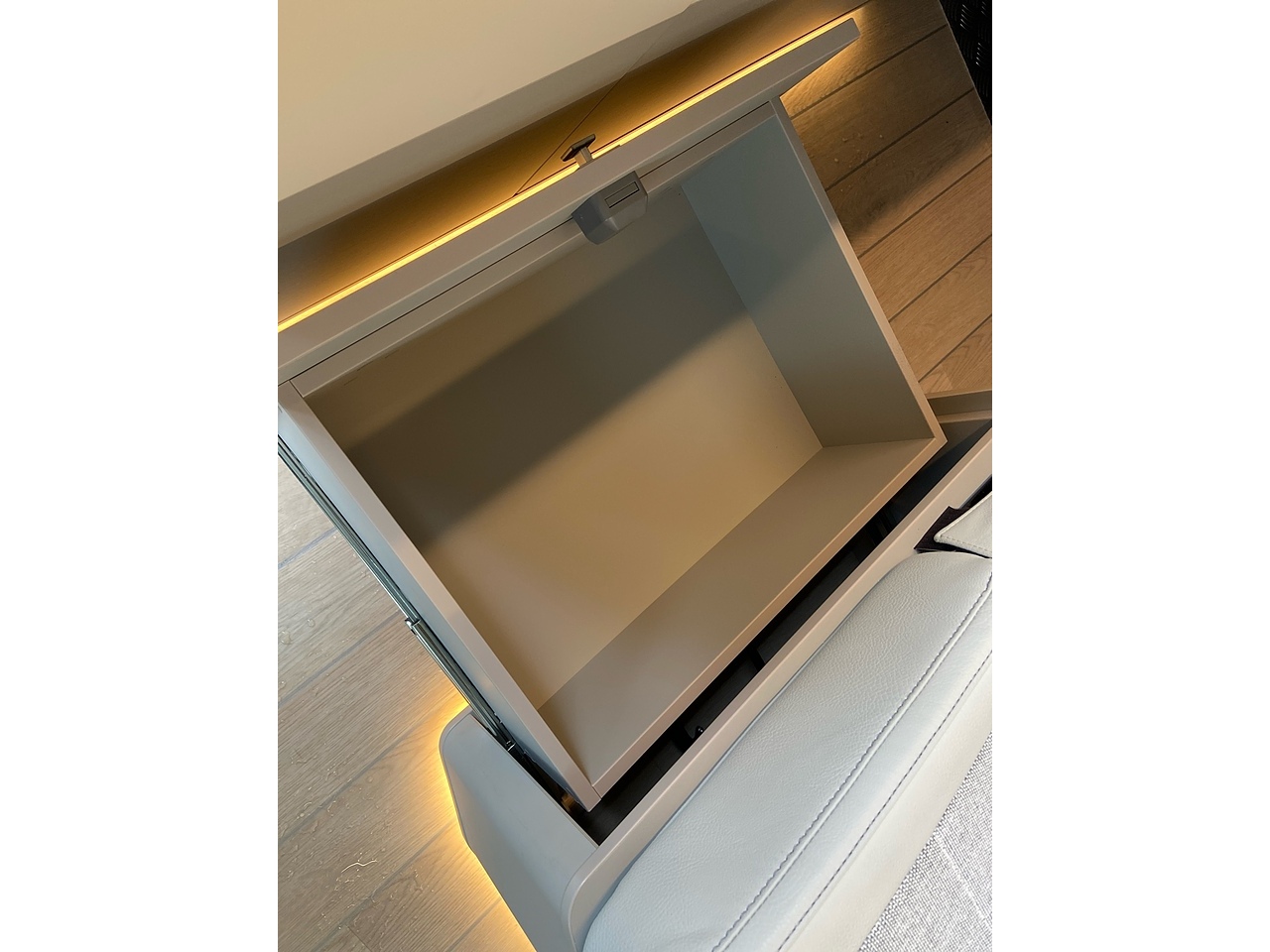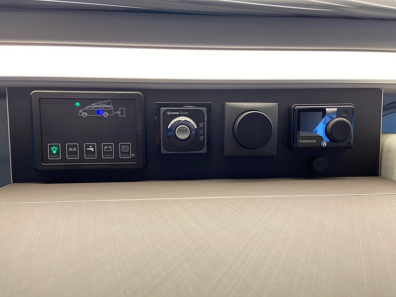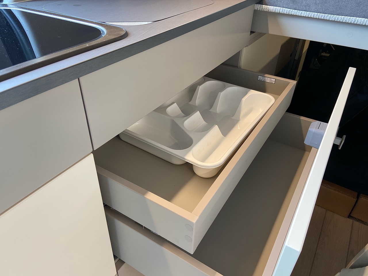 Full Kitchen: The side kitchen unit is equipped with two gas burners, a 51-litre compressor fridge, a sink, and a Truma hot water system.