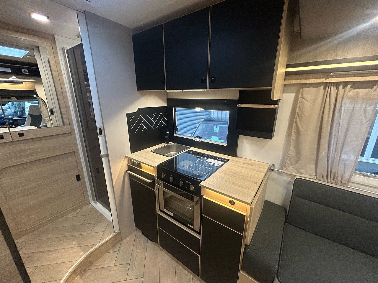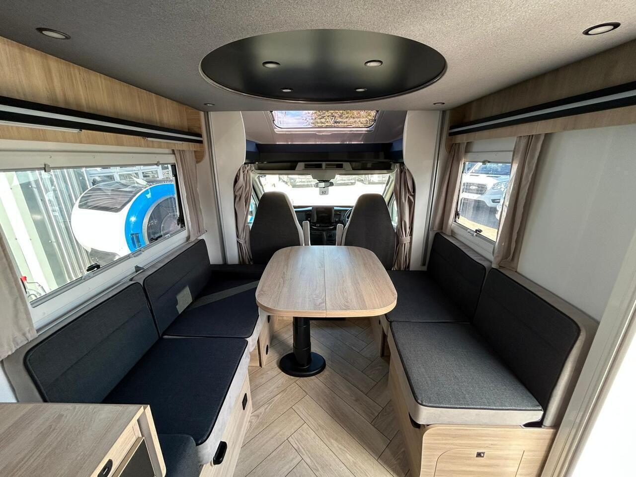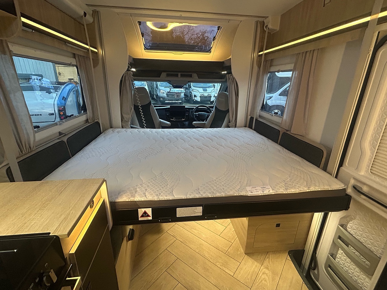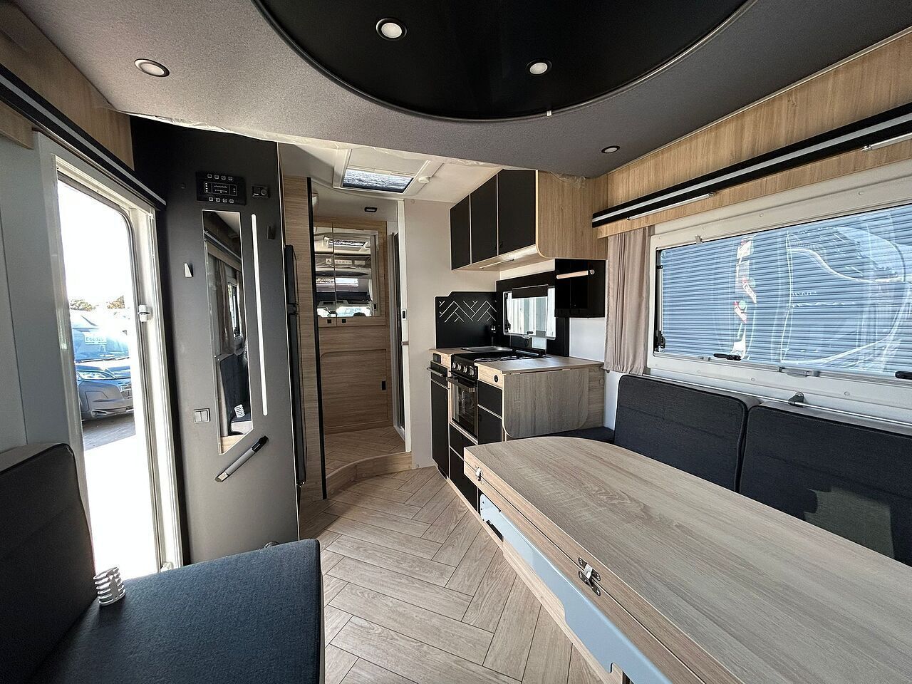 Manual cab air conditioning, Driver and passenger airbag, Electric handbrake, Swivel seats in the cab, with double armrests and adjustable height, Cab seat covers with matching cushions, Electric de-icing rearview mirrors, Cruise control and speed limiter, ESP, START & STOP, Unit step insulation, Unit step lighting, Cab panoramic skylight, Panoramic skylight (or two skylights), Double-locking windows with combined blinds/screens, Atmosphere LED lighting on floor, USB ports, External water intake, IRP structure: GRP on roof/floor/sides, floor 64 mm thick, 6-speed automatic gearbox, Coded front bumper, 16" alloy wheels black, Backlit entrance mirror, Wardrobe with drawers, Gas external socket, External shower, Automatically lighted headlights and windshield wipers, Fog lamps, Luxury entrance door with window and central locking cab/cell, Premium mattress main berth, Wooden shower duck board, TV-ready, Wardrobe, Solar panel, Heating using vehicle fuel digitally programmed and used while on the road, Rear camera, Oven, TV bracket.