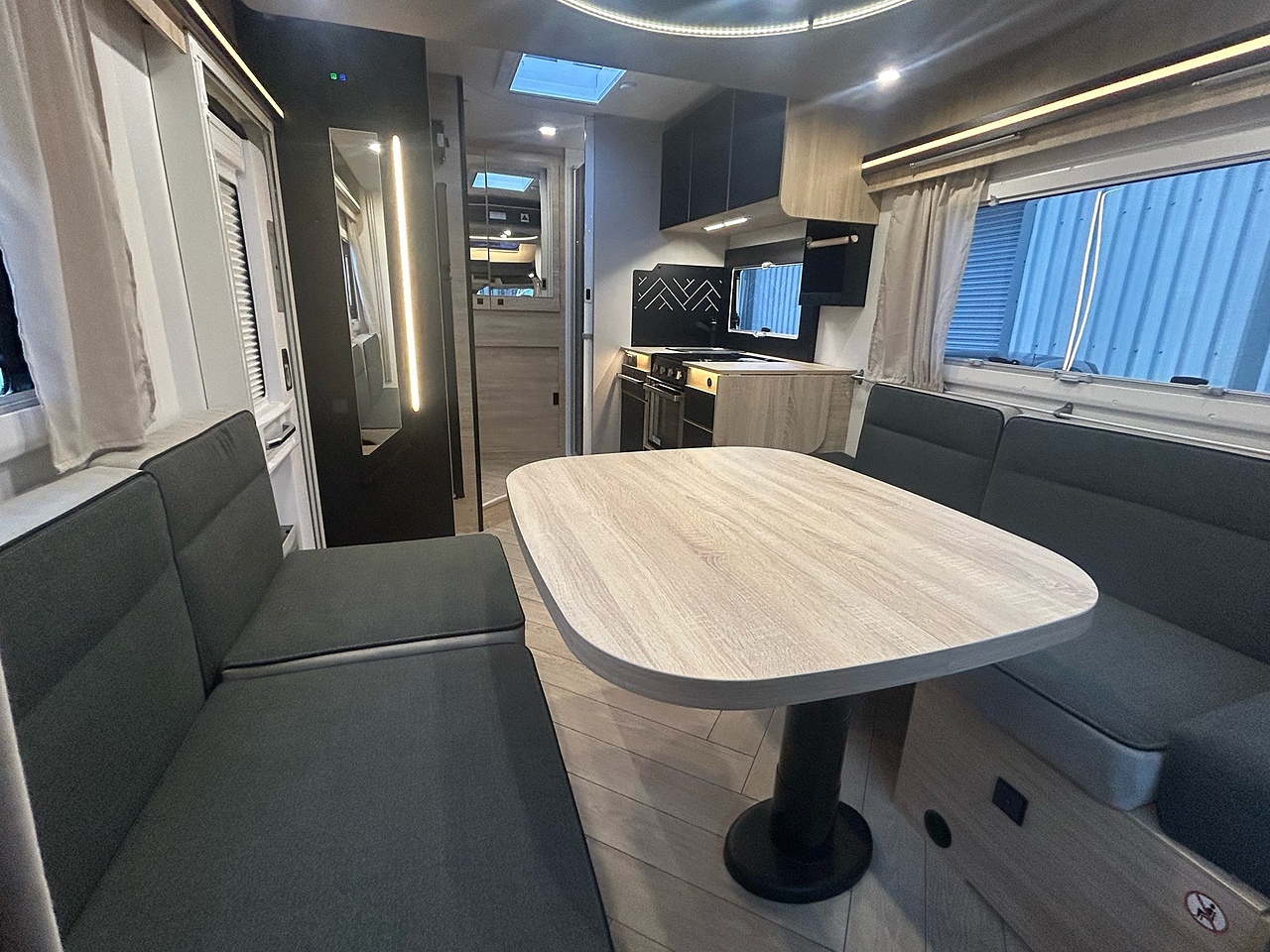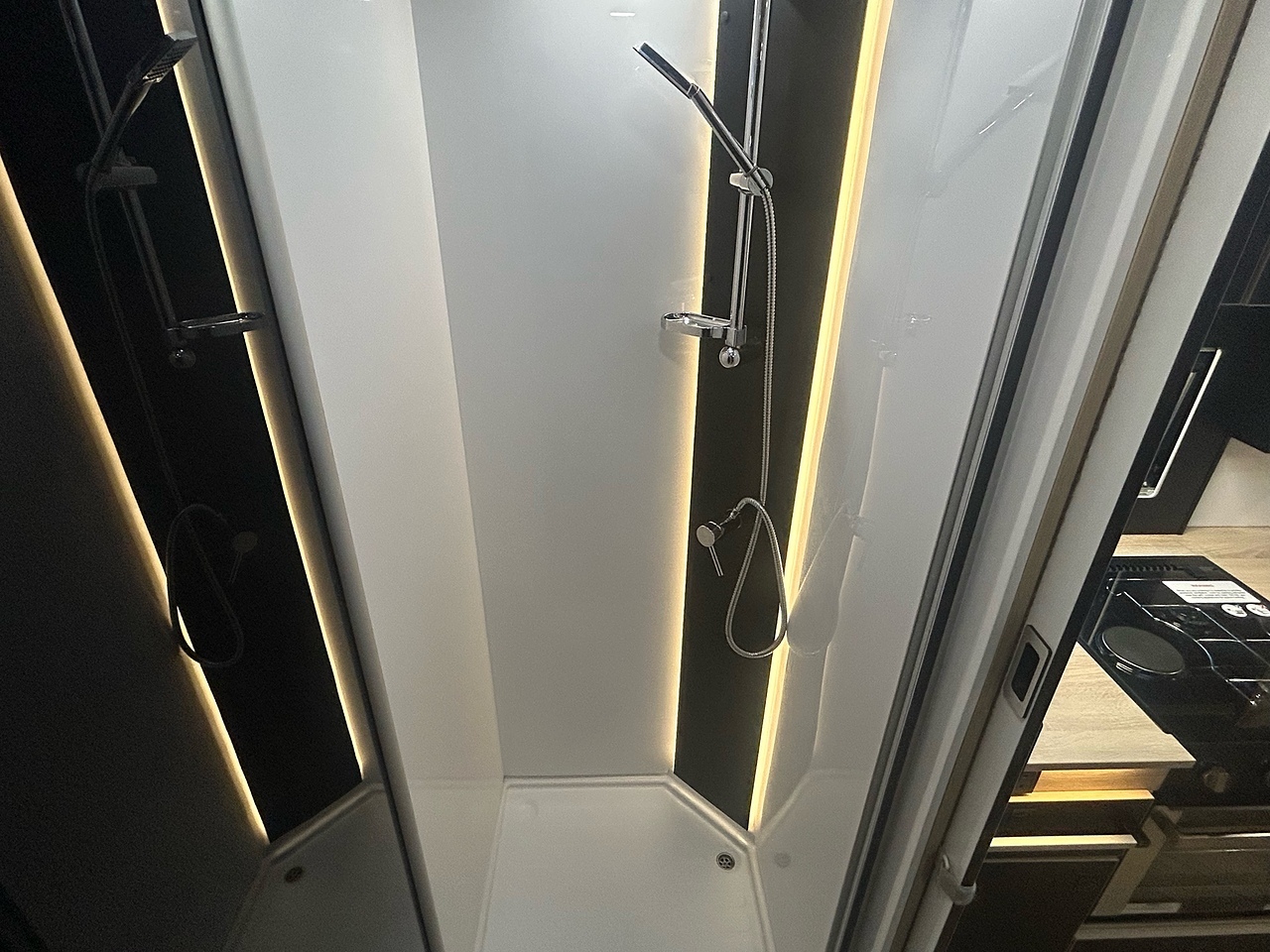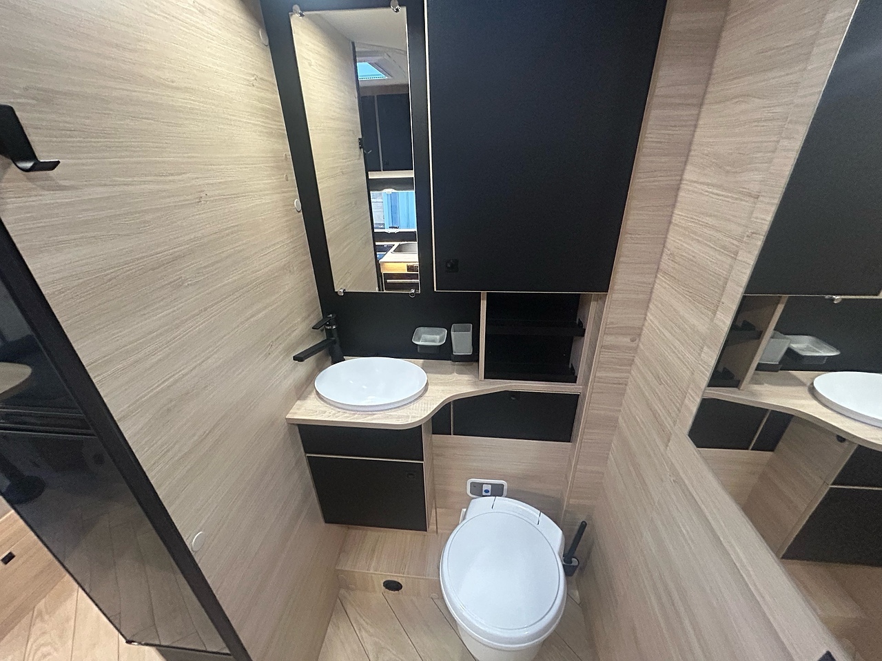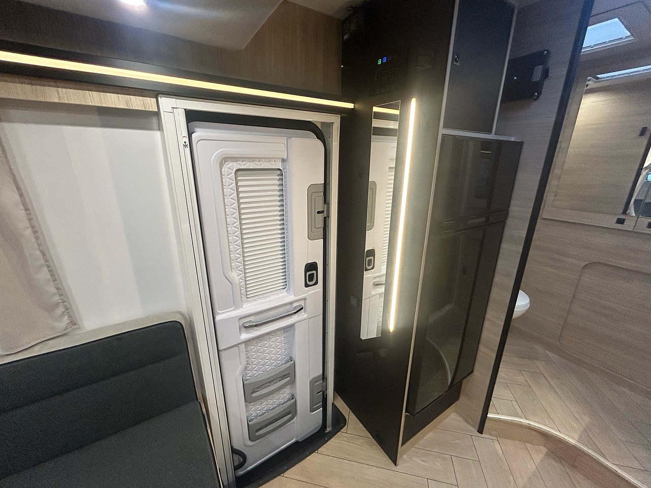 Manual cab air conditioning, Driver and passenger airbag, Electric handbrake, Swivel seats in the cab, with double armrests and adjustable height, Cab seat covers with matching cushions, Electric de-icing rearview mirrors, Cruise control and speed limiter, ESP, START & STOP, Unit step insulation, Unit step lighting, Cab panoramic skylight, Panoramic skylight (or two skylights), Double-locking windows with combined blinds/screens, Atmosphere LED lighting on floor, USB ports, External water intake, IRP structure: GRP on roof/floor/sides, floor 64 mm thick, 6-speed automatic gearbox, Coded front bumper, 16" alloy wheels black, Backlit entrance mirror, Wardrobe with drawers, Gas external socket, External shower, Automatically lighted headlights and windshield wipers, Fog lamps, Luxury entrance door with window and central locking cab/cell, Premium mattress main berth, Wooden shower duck board, TV-ready, Wardrobe, Solar panel, Heating using vehicle fuel digitally programmed and used while on the road, Rear camera, Oven, TV bracket.