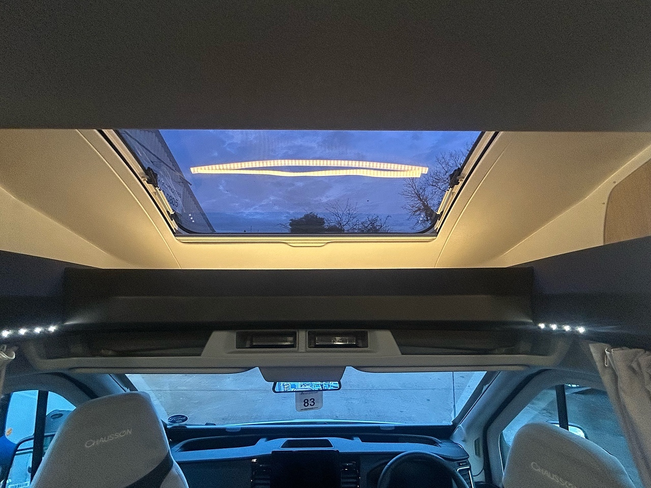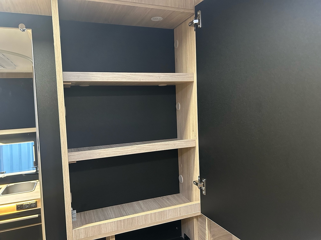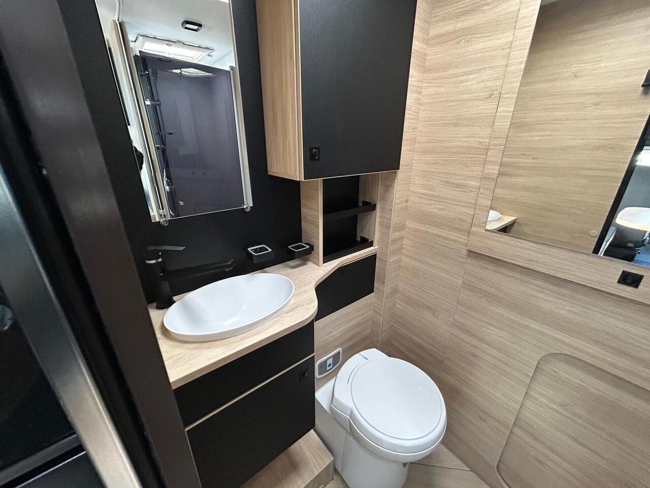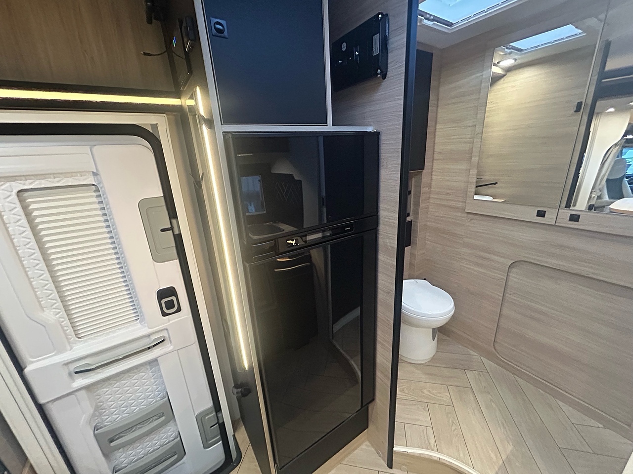 Manual cab air conditioning, Driver and passenger airbag, Electric handbrake, Swivel seats in the cab, with double armrests and adjustable height, Cab seat covers with matching cushions, Electric de-icing rearview mirrors, Cruise control and speed limiter, ESP, START & STOP, Unit step insulation, Unit step lighting, Cab panoramic skylight, Panoramic skylight (or two skylights), Double-locking windows with combined blinds/screens, Atmosphere LED lighting on floor, USB ports, External water intake, IRP structure: GRP on roof/floor/sides, floor 64 mm thick, 6-speed automatic gearbox, Coded front bumper, 16" alloy wheels black, Backlit entrance mirror, Wardrobe with drawers, Gas external socket, External shower, Automatically lighted headlights and windshield wipers, Fog lamps, Luxury entrance door with window and central locking cab/cell, Premium mattress main berth, Wooden shower duck board, TV-ready, Wardrobe, Solar panel, Heating using vehicle fuel digitally programmed and used while on the road, Rear camera, Oven, TV bracket.