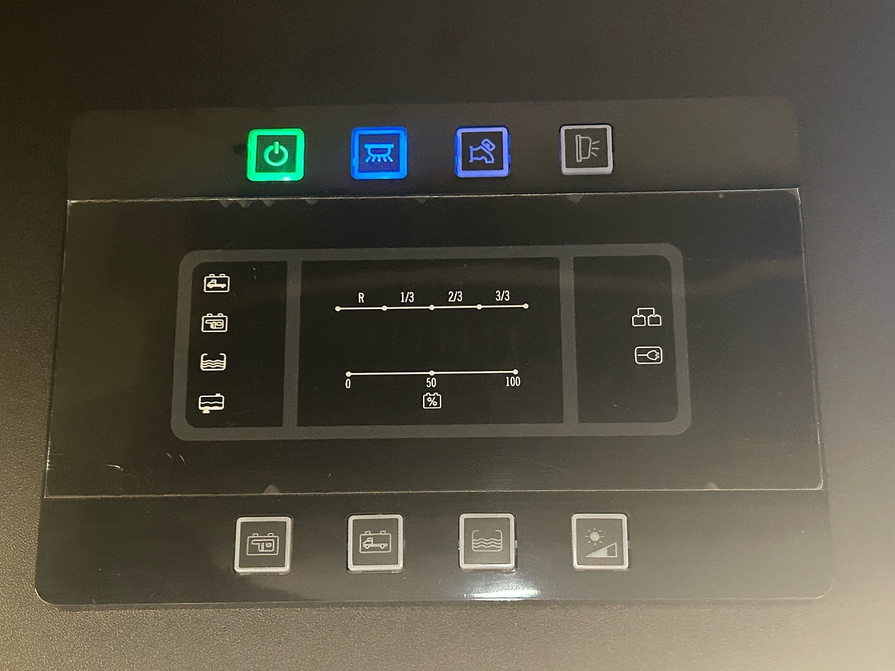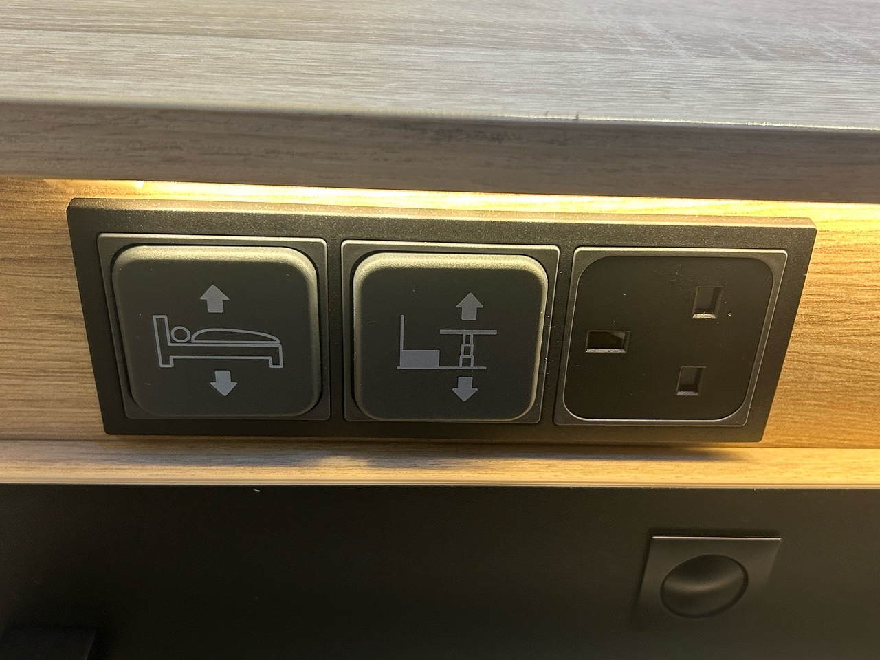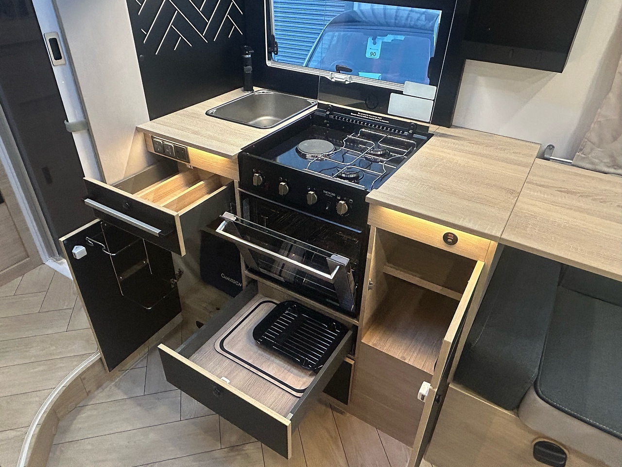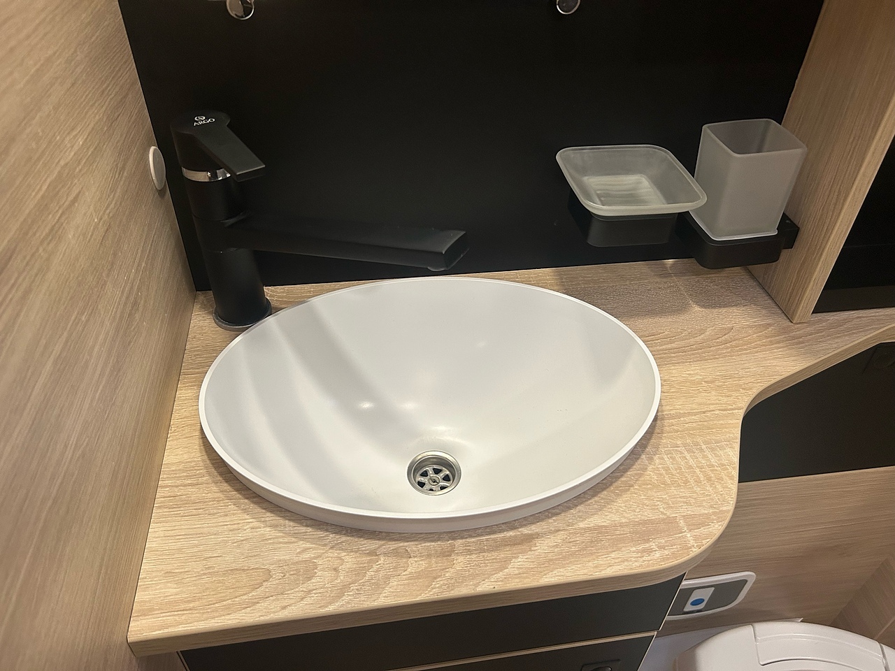 Manual cab air conditioning, Driver and passenger airbag, Electric handbrake, Swivel seats in the cab, with double armrests and adjustable height, Cab seat covers with matching cushions, Electric de-icing rearview mirrors, Cruise control and speed limiter, ESP, START & STOP, Unit step insulation, Unit step lighting, Cab panoramic skylight, Panoramic skylight (or two skylights), Double-locking windows with combined blinds/screens, Atmosphere LED lighting on floor, USB ports, External water intake, IRP structure: GRP on roof/floor/sides, floor 64 mm thick, 6-speed automatic gearbox, Coded front bumper, 16" alloy wheels black, Backlit entrance mirror, Wardrobe with drawers, Gas external socket, External shower, Automatically lighted headlights and windshield wipers, Fog lamps, Luxury entrance door with window and central locking cab/cell, Premium mattress main berth, Wooden shower duck board, TV-ready, Wardrobe, Solar panel, Heating using vehicle fuel digitally programmed and used while on the road, Rear camera, Oven, TV bracket.