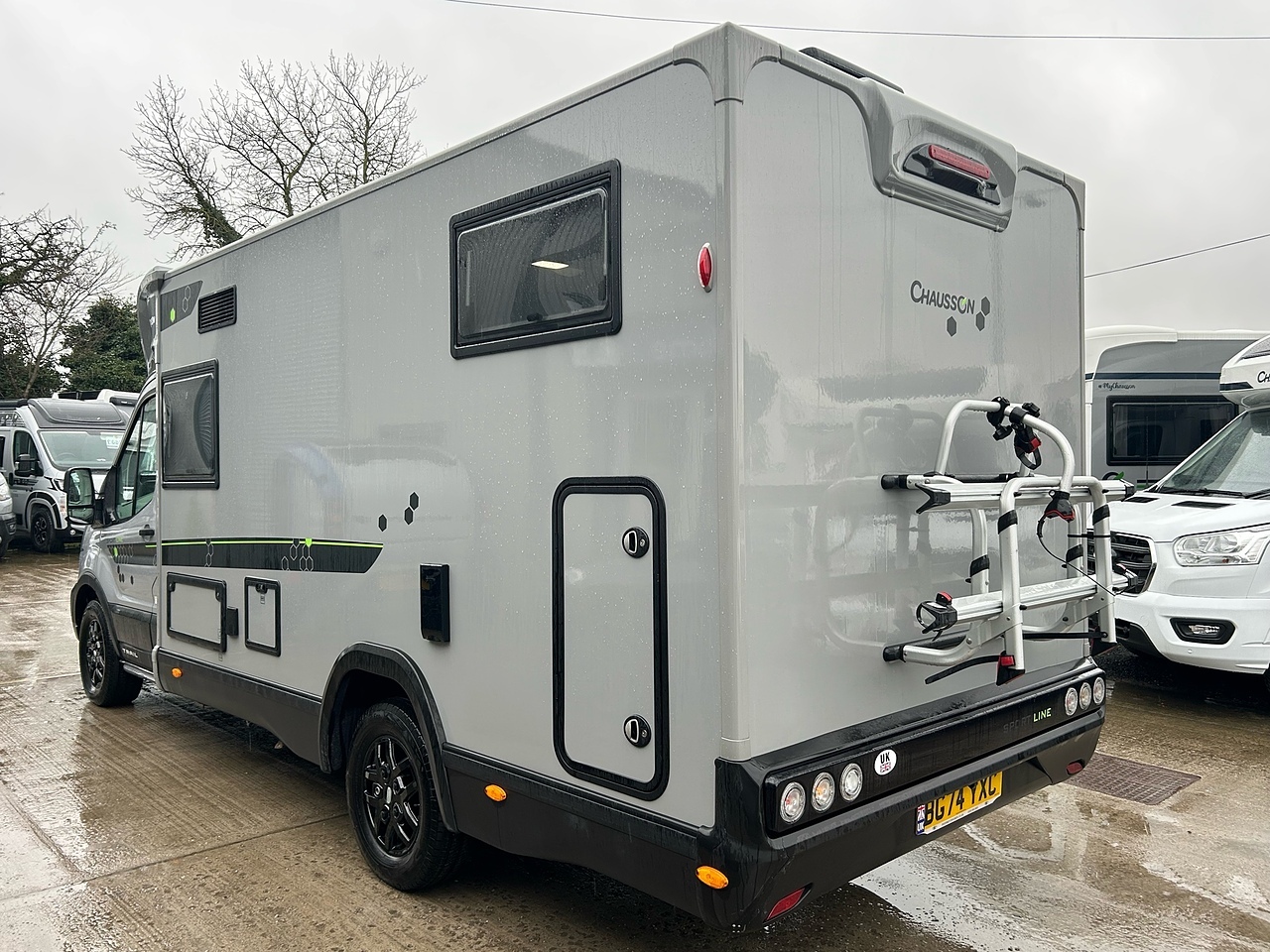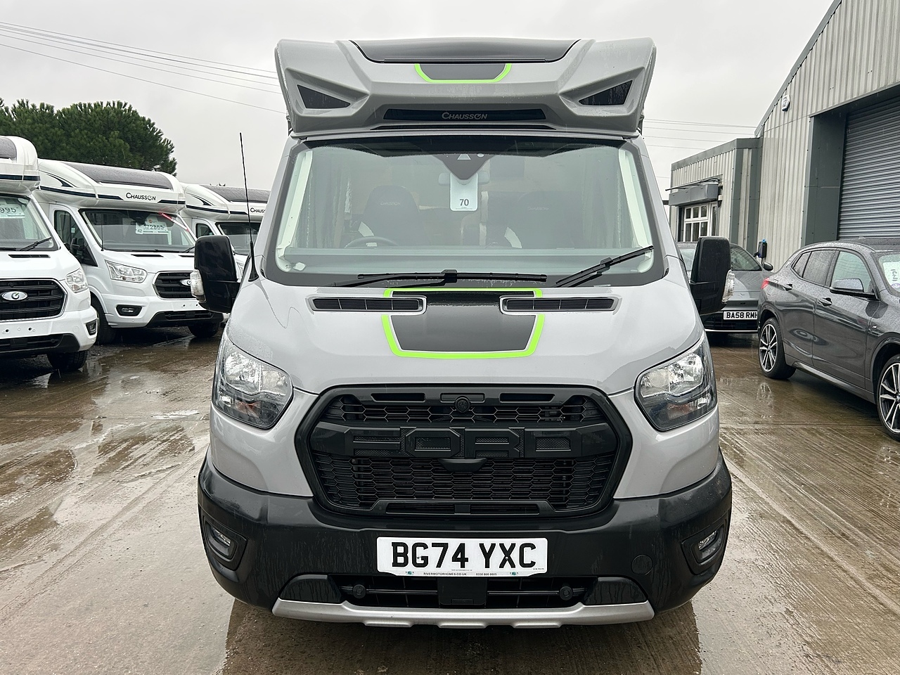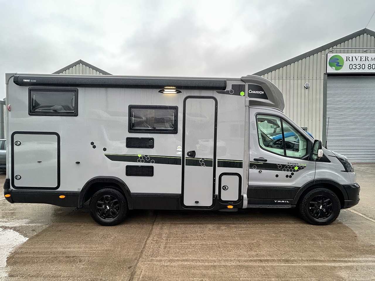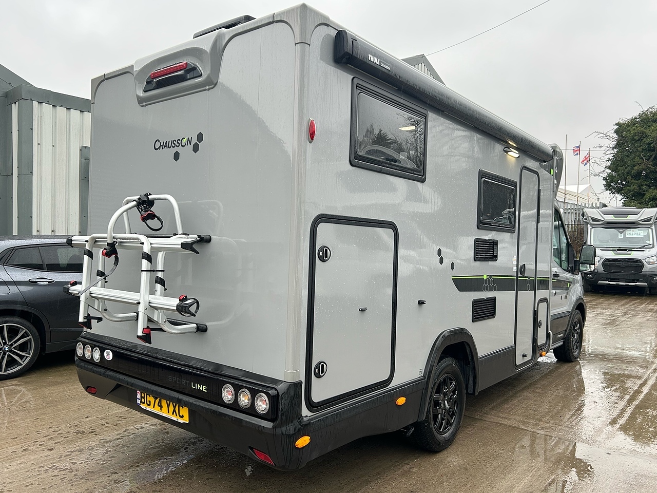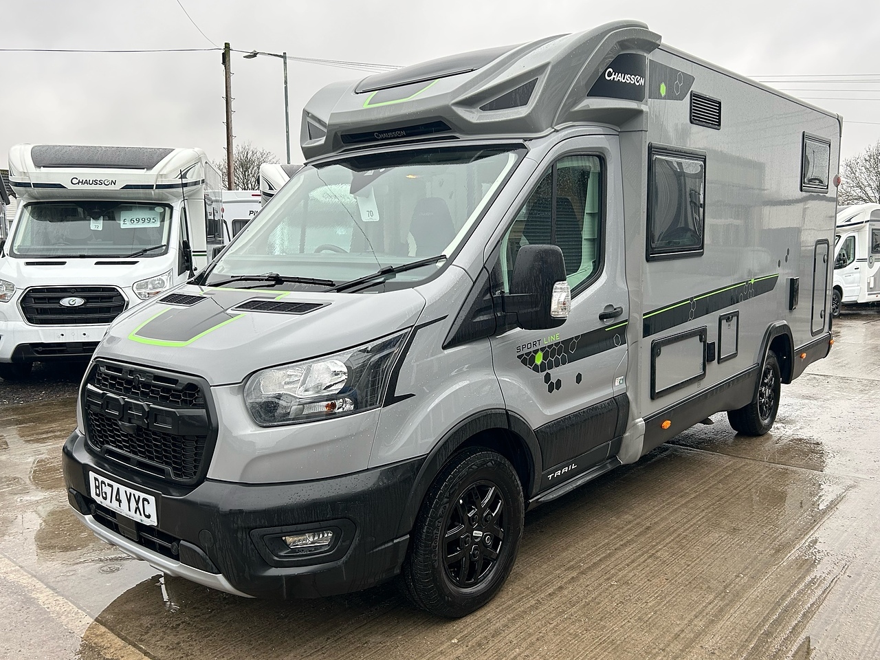 The 2024 Chausson S697 Sport Line is a sleek, compact motorhome designed for adventurous couples or small families. Measuring 6.59 meters in length and just 2.10 meters wide, it offers the agility of a campervan with the comfort of a coachbuilt motorhome.Key Features:Sleeping Seating: Accommodates up to three people with rear single beds above a spacious garage, which can convert into a large double bed. An additional single bed can be made up in the dining area, just behind the swivel cab chairs. Equipped with four seatbelts for safe travel.Interior Amenities: Features a well-equipped side kitchen with a grill, a 135L compressor fridge, and a cleverly designed washroom with a swivel partition, allowing you to create a dedicated shower space in seconds. The garage includes mains and 12V sockets, as well as a heater outlet. Technology & Comfort: Comes standard with the Connect Pack, offering a DAB/Bluetooth radio with touchscreen, steering wheel controls, and a reversing camera. The Accessory Pack includes an exterior awning, solar panel, door mosquito net, cab blinds, and a second battery installation kit. Built on a Ford Transit chassis with 2.0L 170HP engine and automatic transmission, it delivers a smooth and efficient driving experience.With its combination of modern technology, practical design, and stylish aesthetics, the Chausson S697 Sport Line is ready to take you on your next adventure. Manufacturer warranty,Immobiliser,4 Travelling Seats,Adjustable seats,Adjustable steering column,Alloy wheels,Remote locking,Cruise control,Power assisted steering,Radio,Multi function steering wheel,Traction control,3 Berth,Door flyscreen,Blinds & flyscreens,Cassette toilet,Blown air central heating,End bedroom,Fixed Bed,Fridge,Hot water,Oven,Shower.