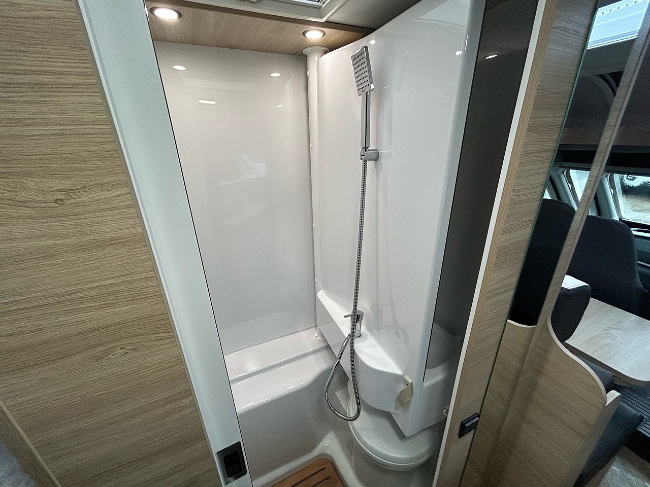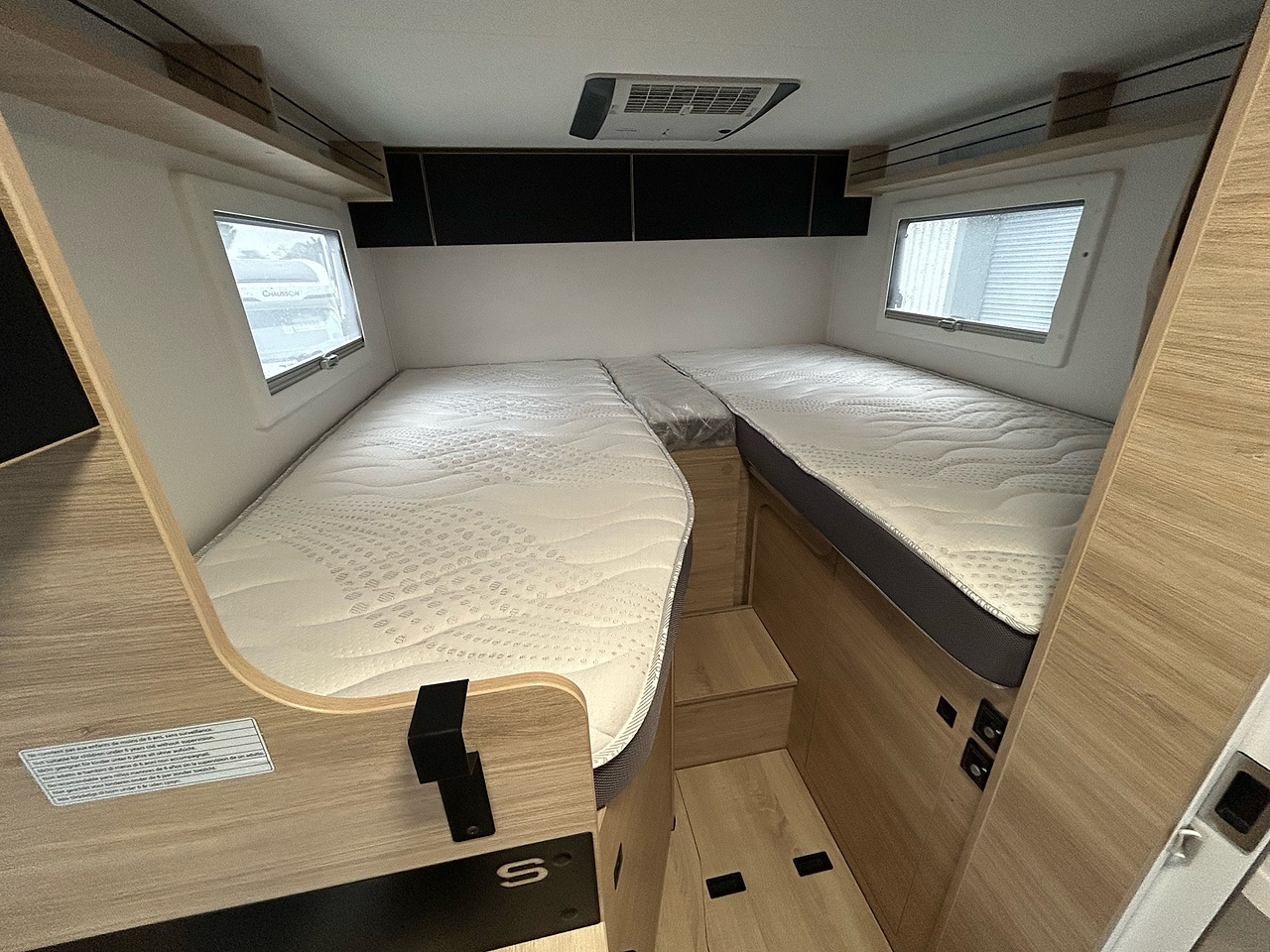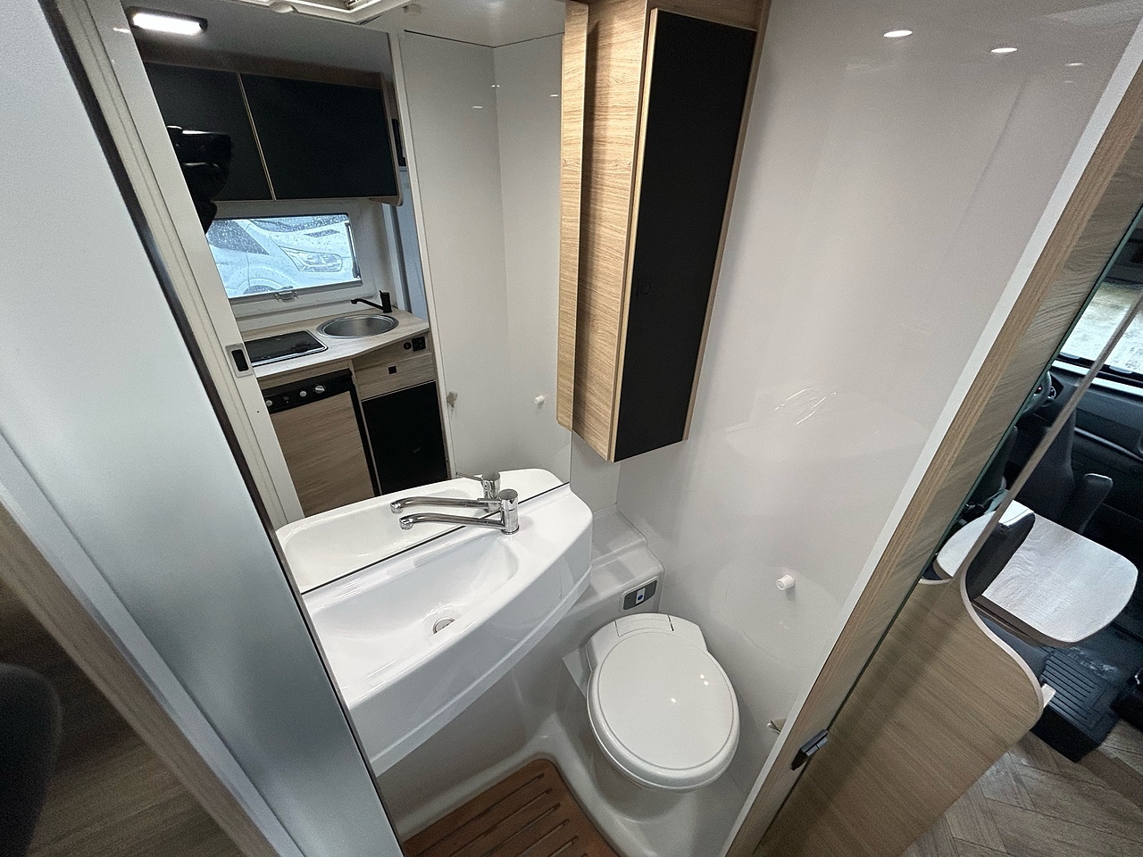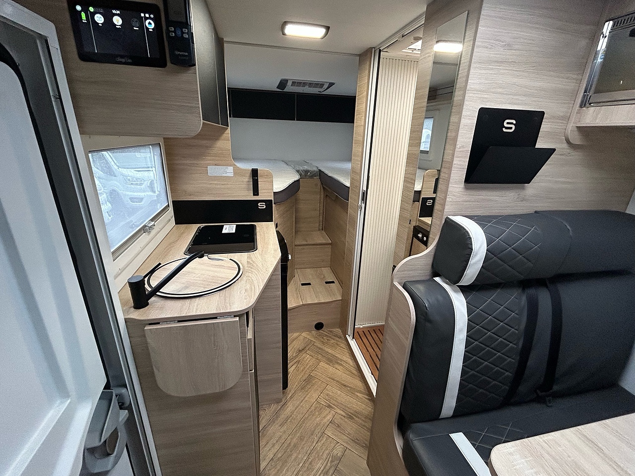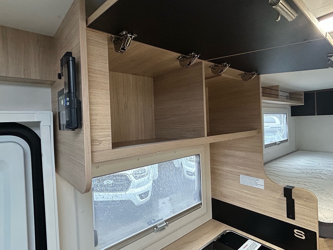 The 2024 Chausson S697 Sport Line is a sleek, compact motorhome designed for adventurous couples or small families. Measuring 6.59 meters in length and just 2.10 meters wide, it offers the agility of a campervan with the comfort of a coachbuilt motorhome.Key Features:Sleeping Seating: Accommodates up to three people with rear single beds above a spacious garage, which can convert into a large double bed. An additional single bed can be made up in the dining area, just behind the swivel cab chairs. Equipped with four seatbelts for safe travel.Interior Amenities: Features a well-equipped side kitchen with a grill, a 135L compressor fridge, and a cleverly designed washroom with a swivel partition, allowing you to create a dedicated shower space in seconds. The garage includes mains and 12V sockets, as well as a heater outlet. Technology & Comfort: Comes standard with the Connect Pack, offering a DAB/Bluetooth radio with touchscreen, steering wheel controls, and a reversing camera. The Accessory Pack includes an exterior awning, solar panel, door mosquito net, cab blinds, and a second battery installation kit. Built on a Ford Transit chassis with 2.0L 170HP engine and automatic transmission, it delivers a smooth and efficient driving experience.With its combination of modern technology, practical design, and stylish aesthetics, the Chausson S697 Sport Line is ready to take you on your next adventure. Manufacturer warranty,Immobiliser,4 Travelling Seats,Adjustable seats,Adjustable steering column,Alloy wheels,Remote locking,Cruise control,Power assisted steering,Radio,Multi function steering wheel,Traction control,3 Berth,Door flyscreen,Blinds & flyscreens,Cassette toilet,Blown air central heating,End bedroom,Fixed Bed,Fridge,Hot water,Oven,Shower.