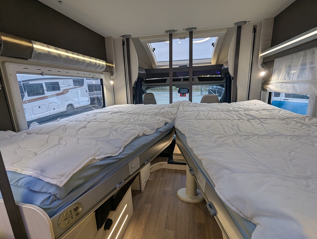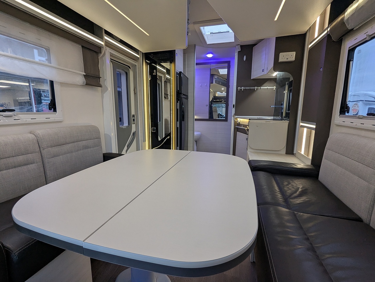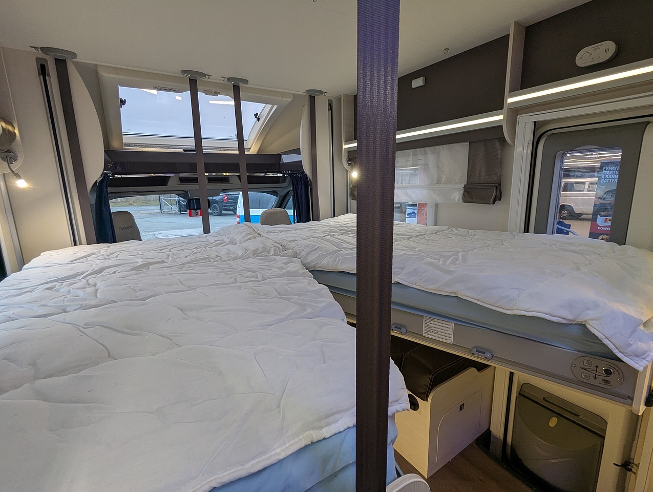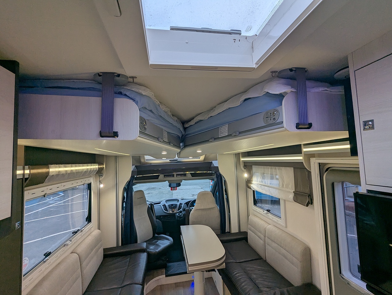 Above the lounge are two single drop-down beds, offering a clever and space-efficient sleeping solution that can be easily lowered when required and neatly stored away during the day, allowing full use of the living area.