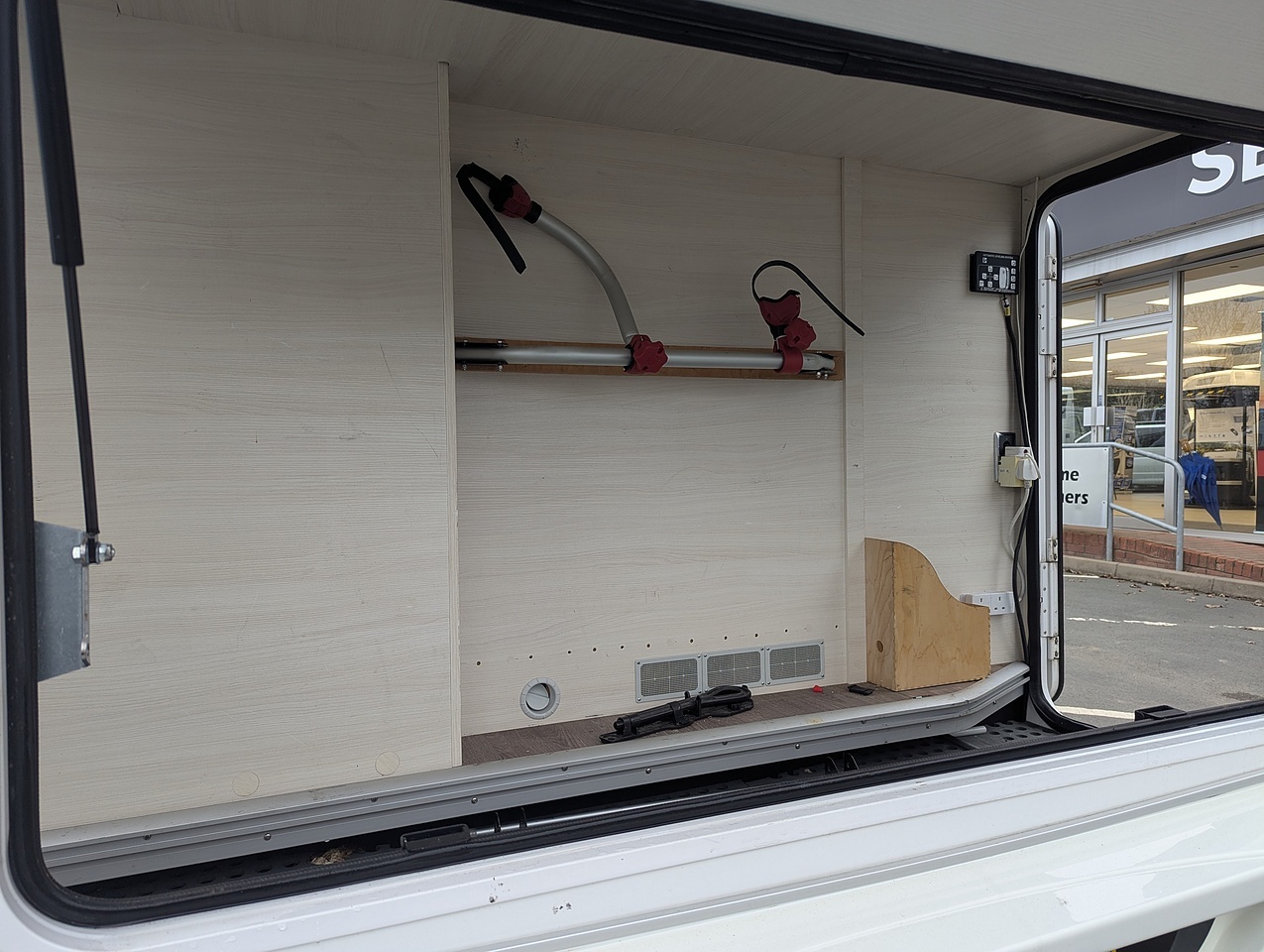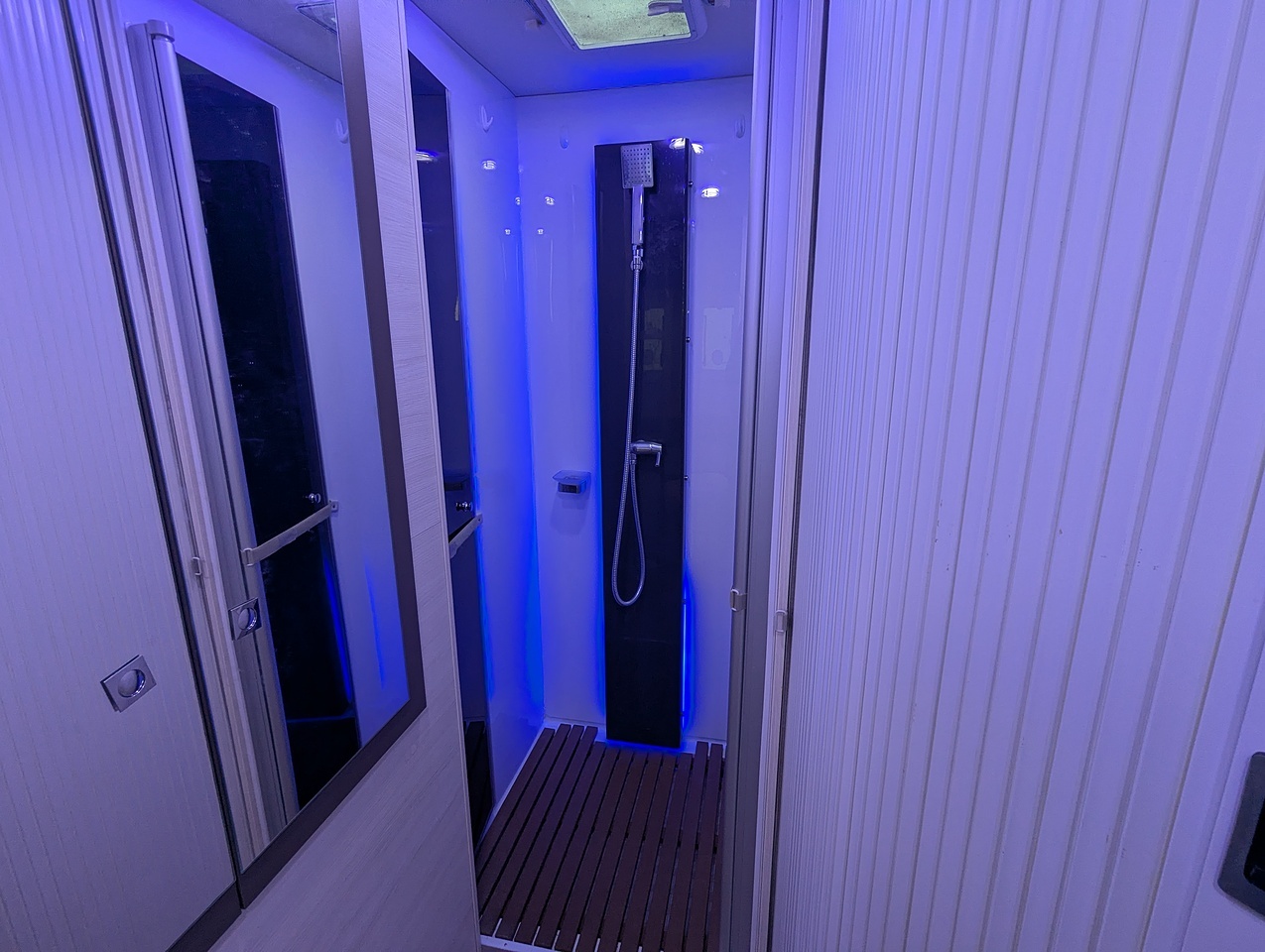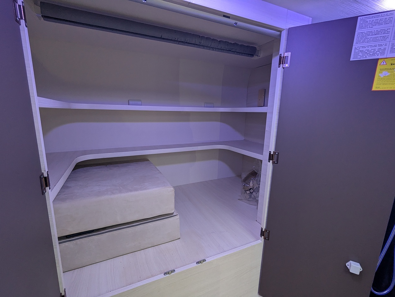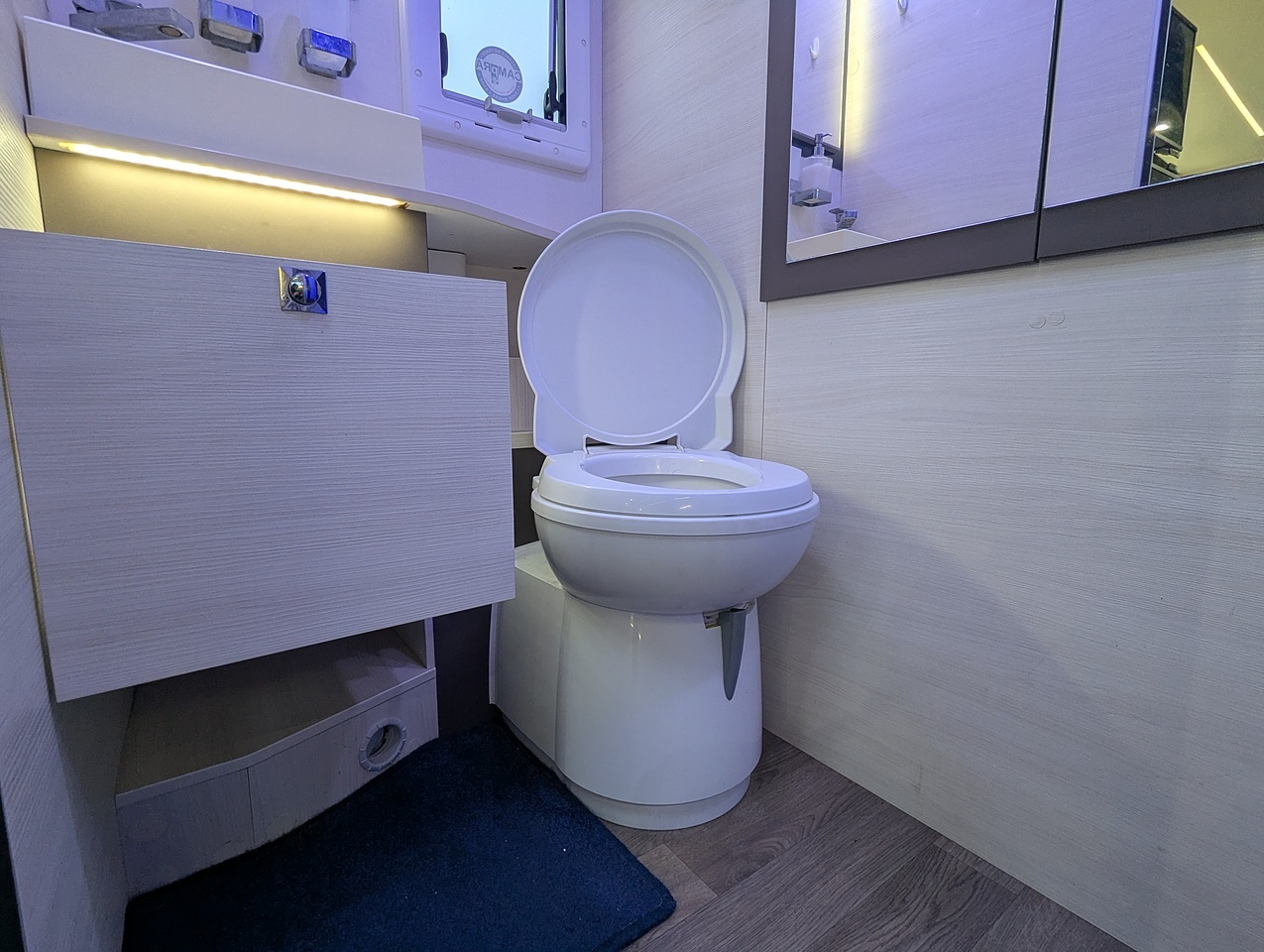 Above the lounge are two single drop-down beds, offering a clever and space-efficient sleeping solution that can be easily lowered when required and neatly stored away during the day, allowing full use of the living area.