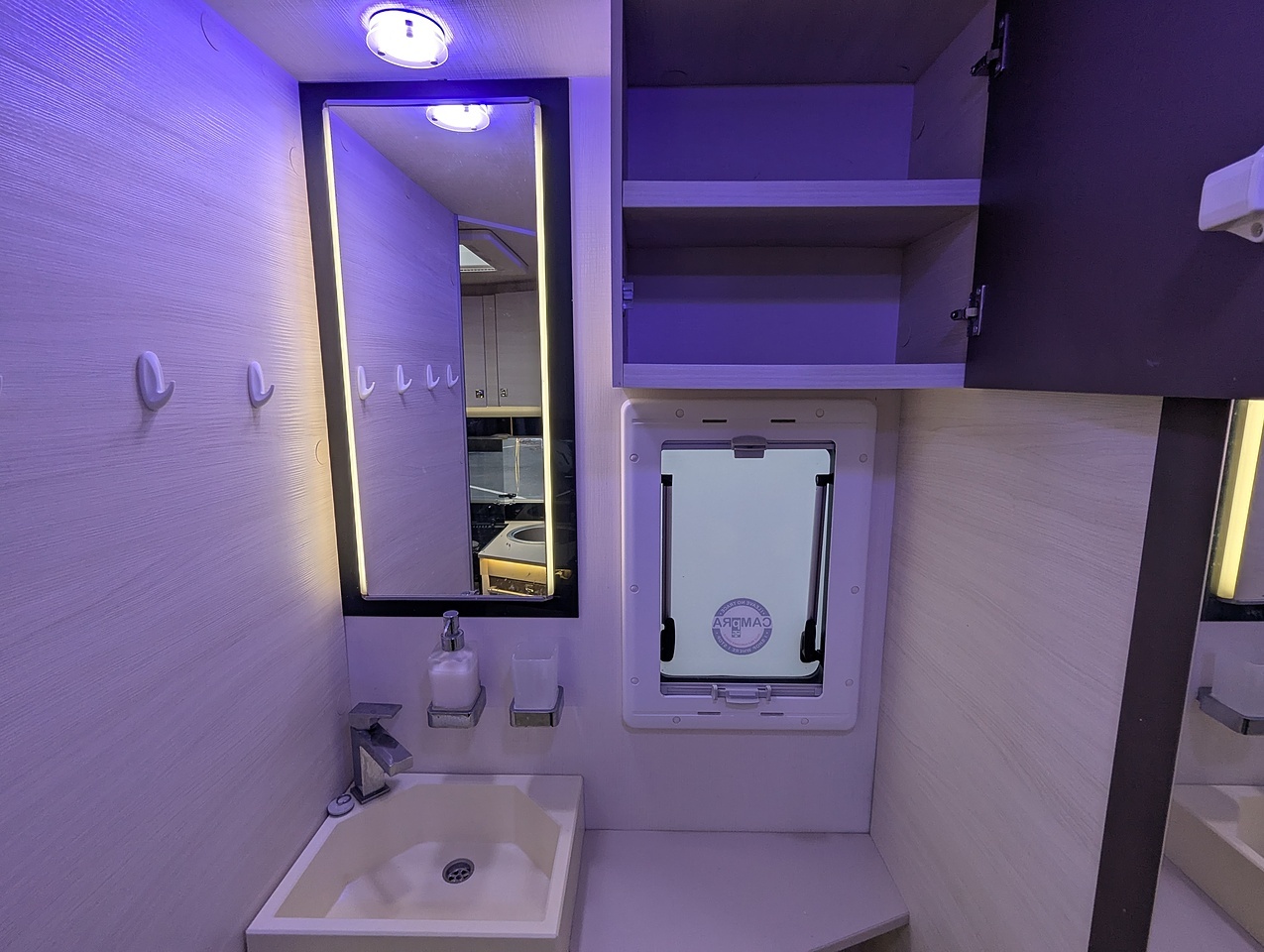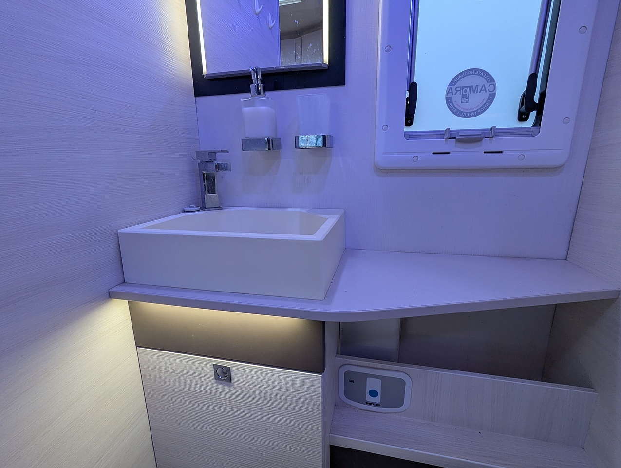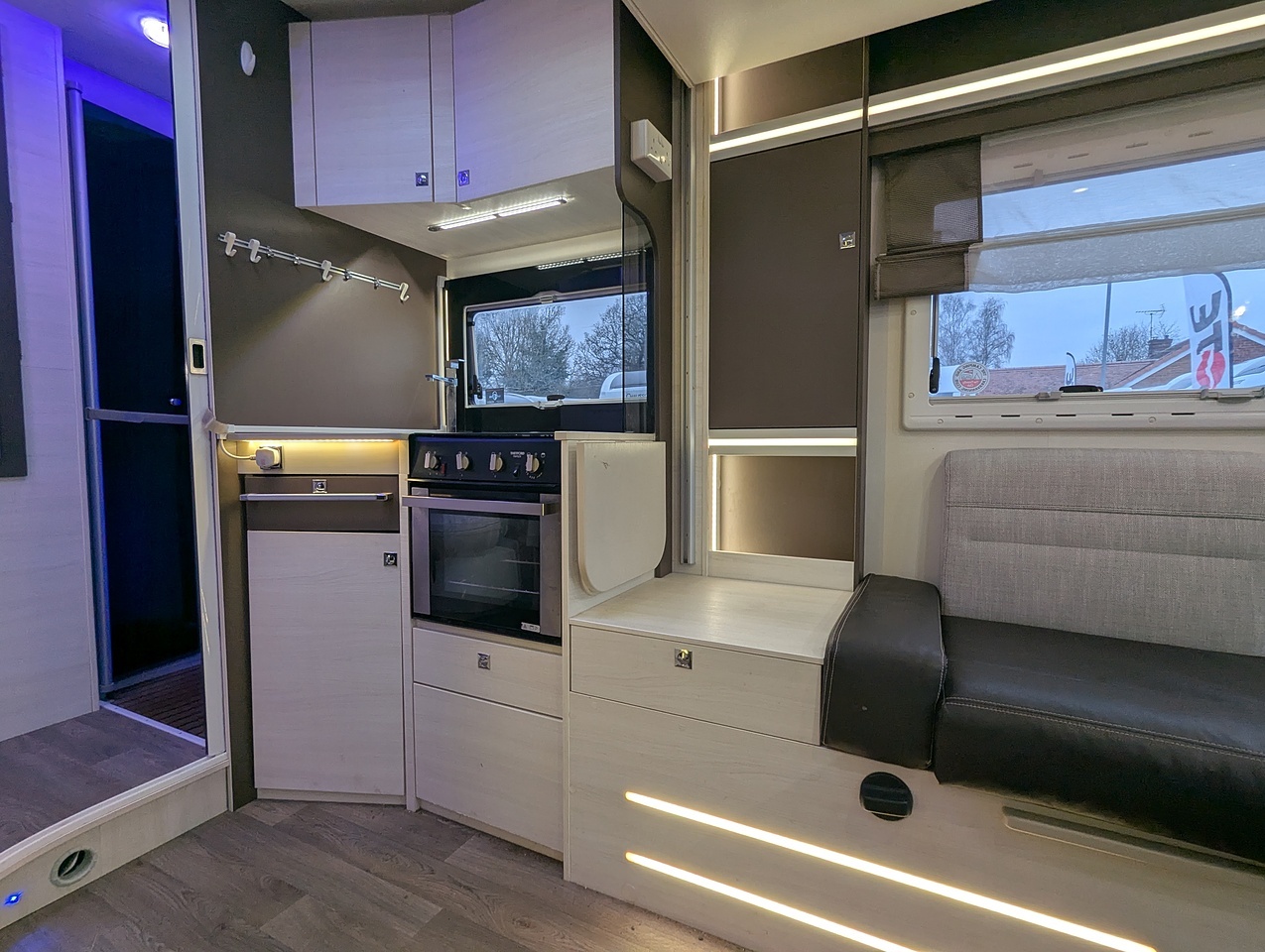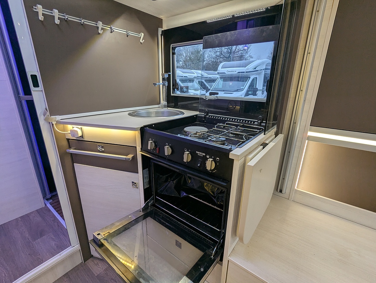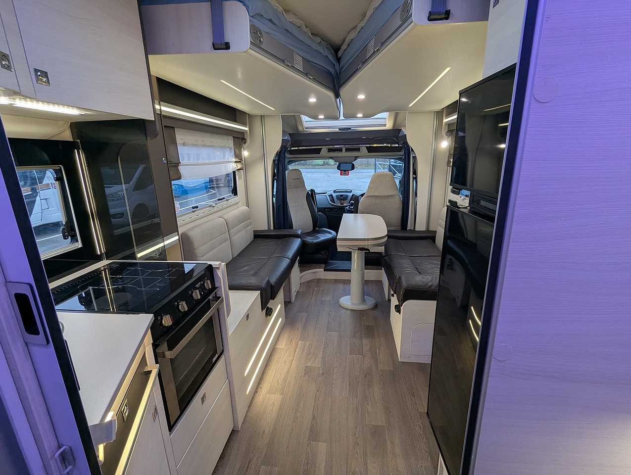 Storage solutions are intelligently integrated throughout the motorhome, ensuring practicality for longer journeys without compromising on interior space.