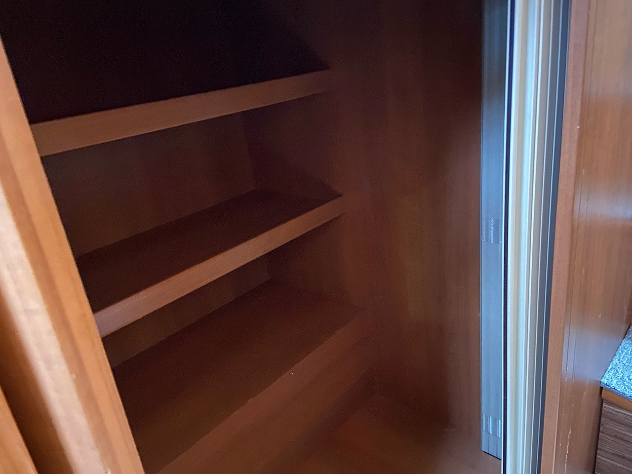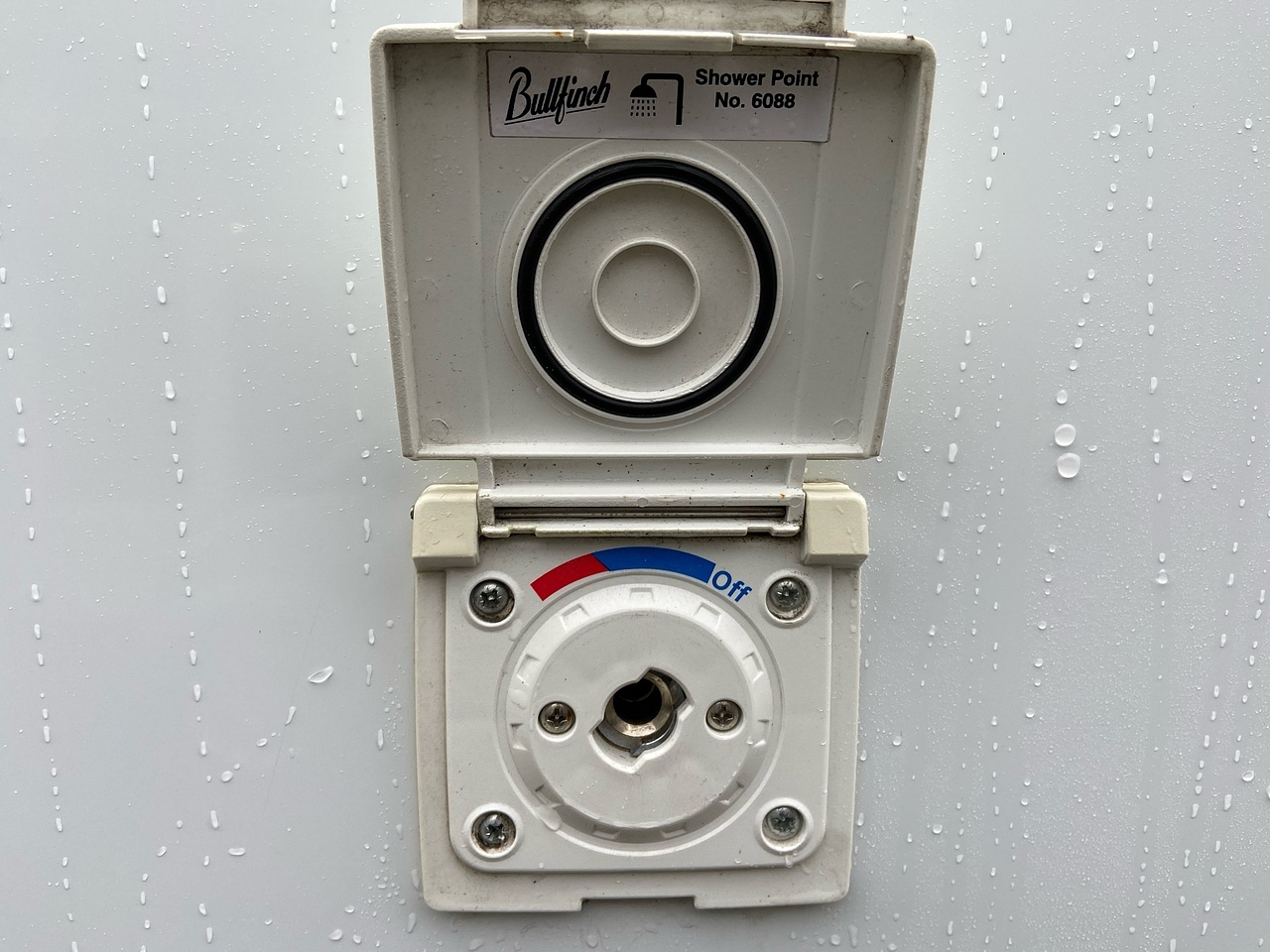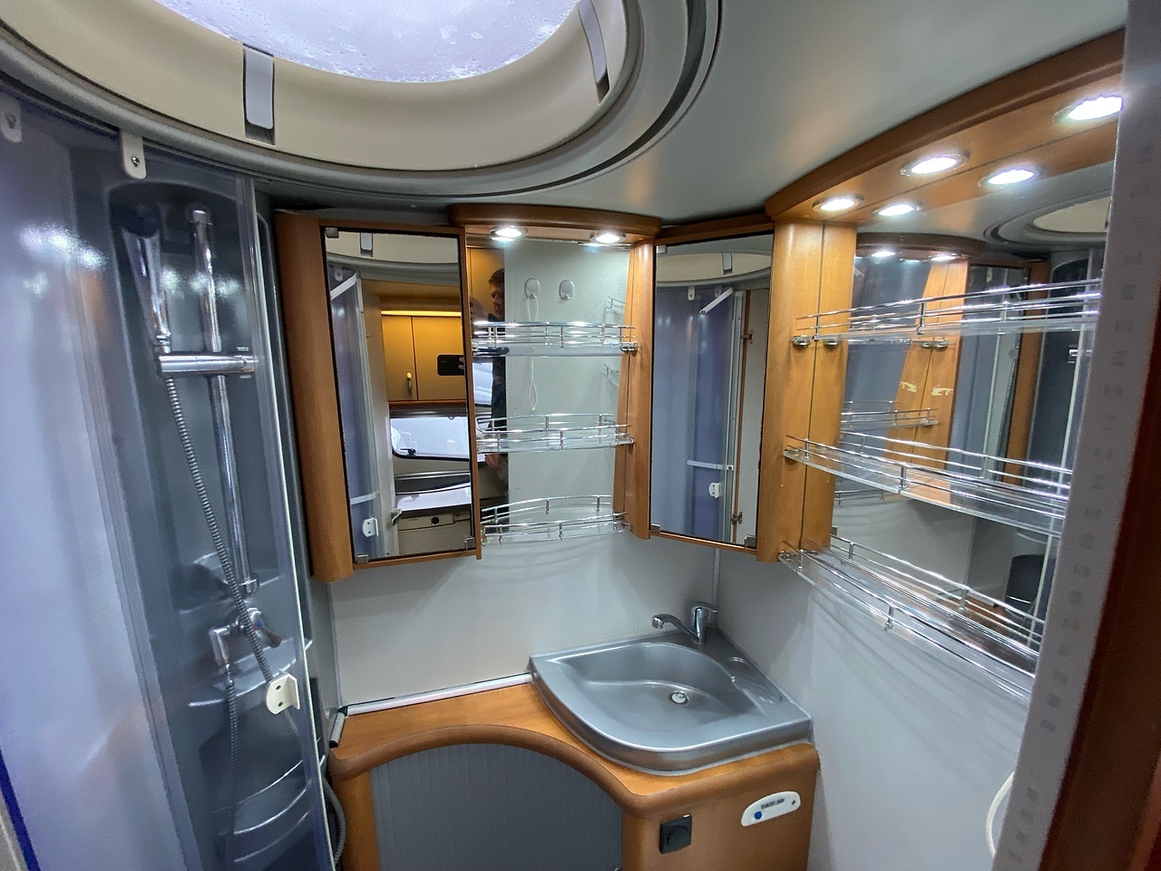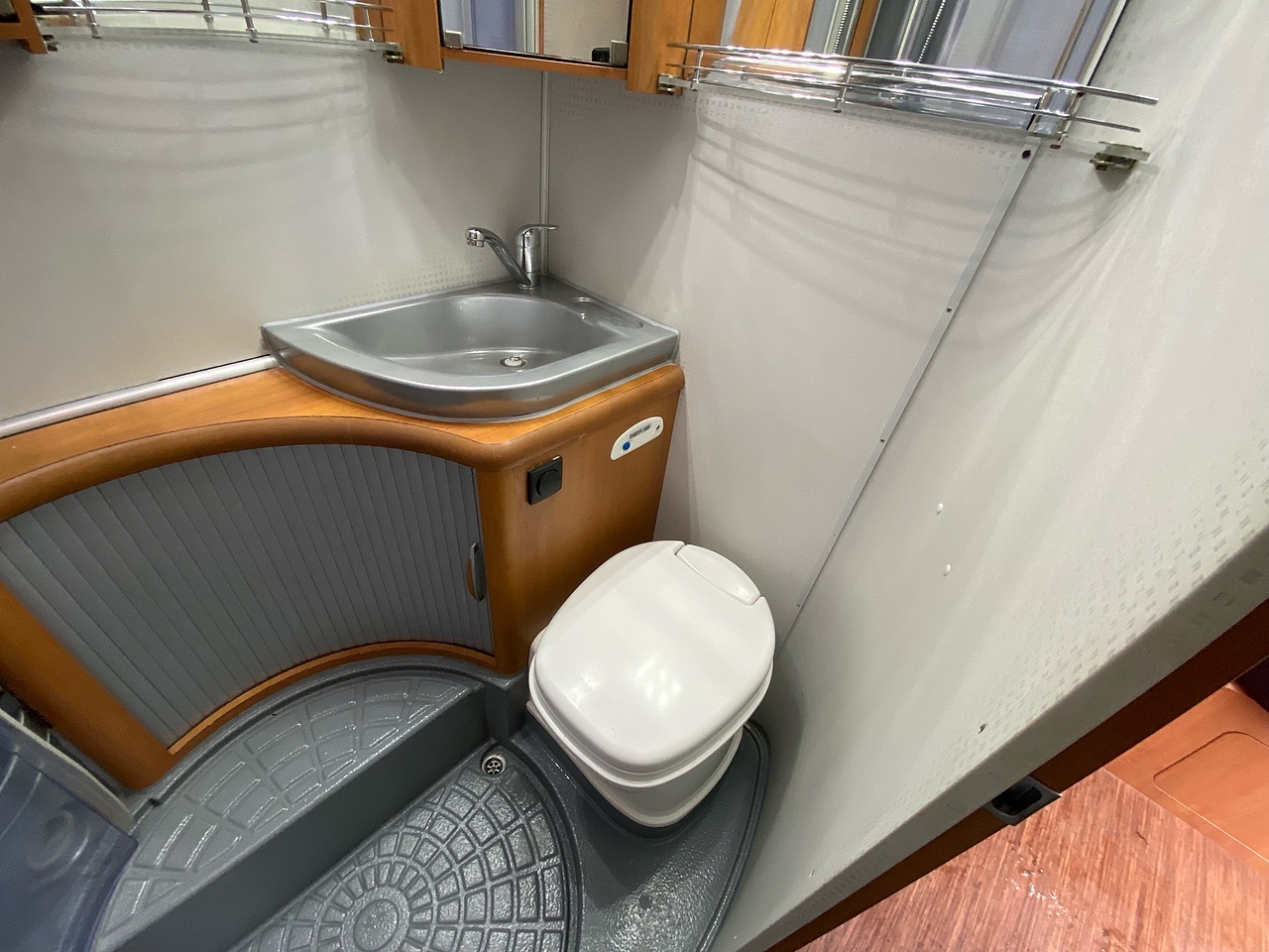 Washroom: Features cassette toilet, shower, sink, and storage.