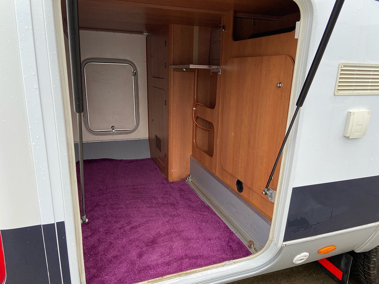 It has a modern kitchen with oven, Truma heating, ample storage, cab air-con, cruise control, solar panel, and large garage.