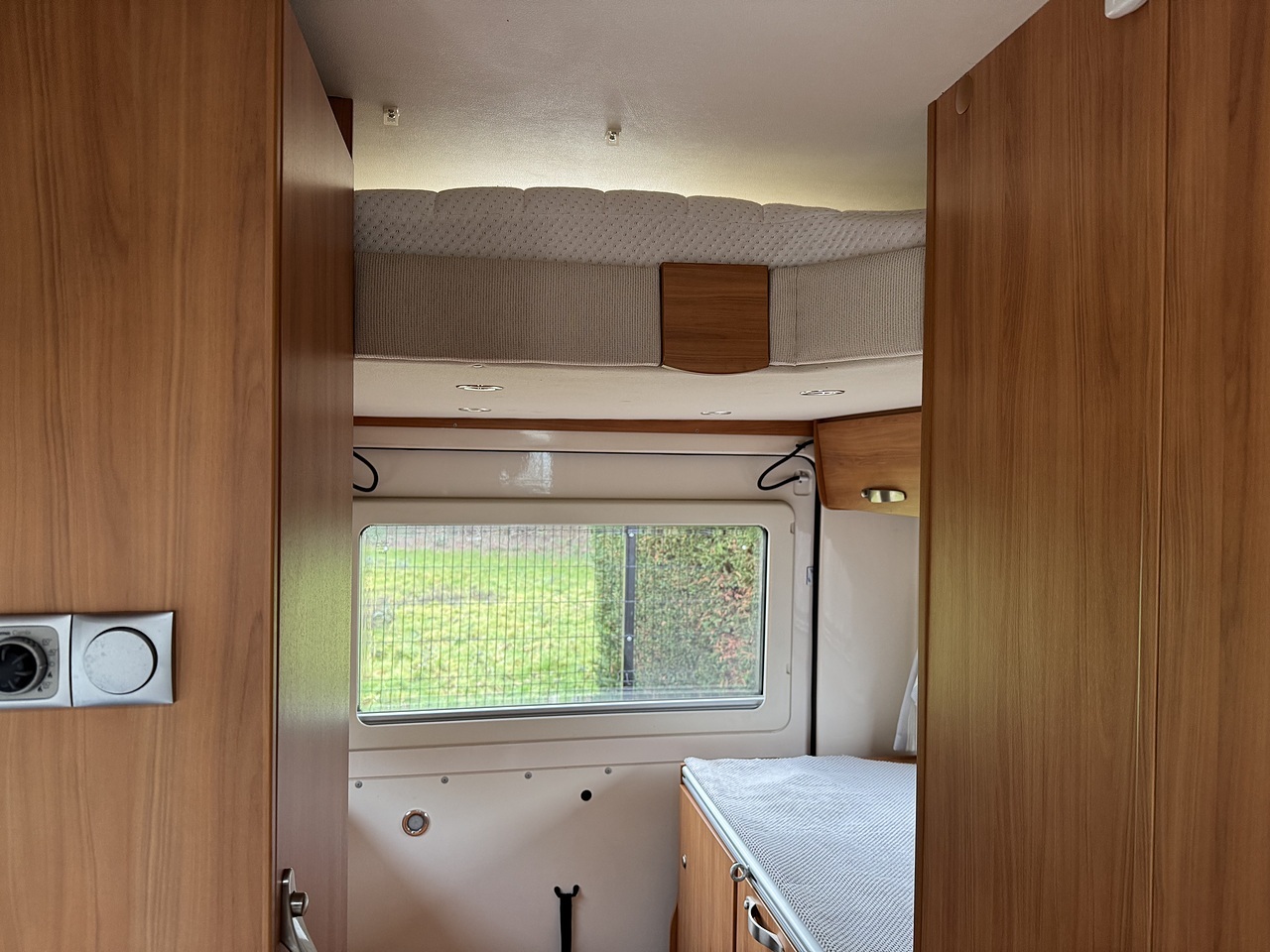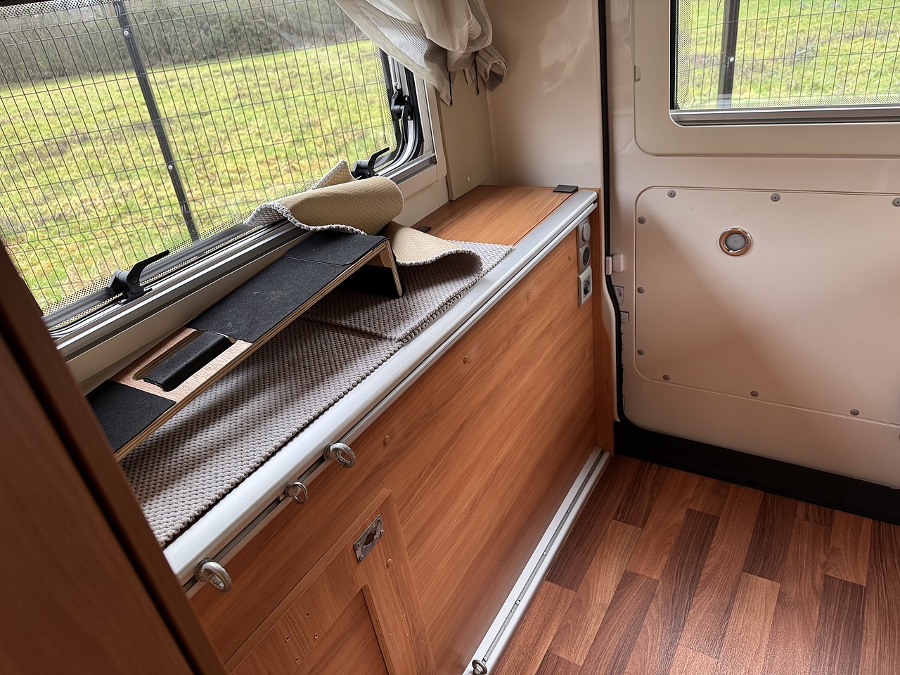 Above the garage is a large drop-down bed, which is simple to operate and accessed via built-in pull-out steps, offering a comfortable and practical sleeping space without compromising daytime living.