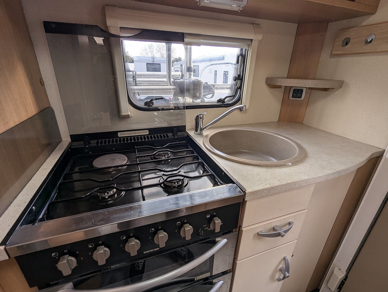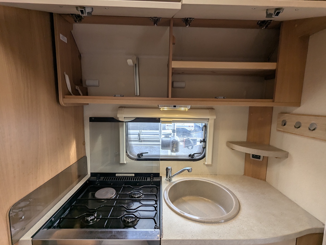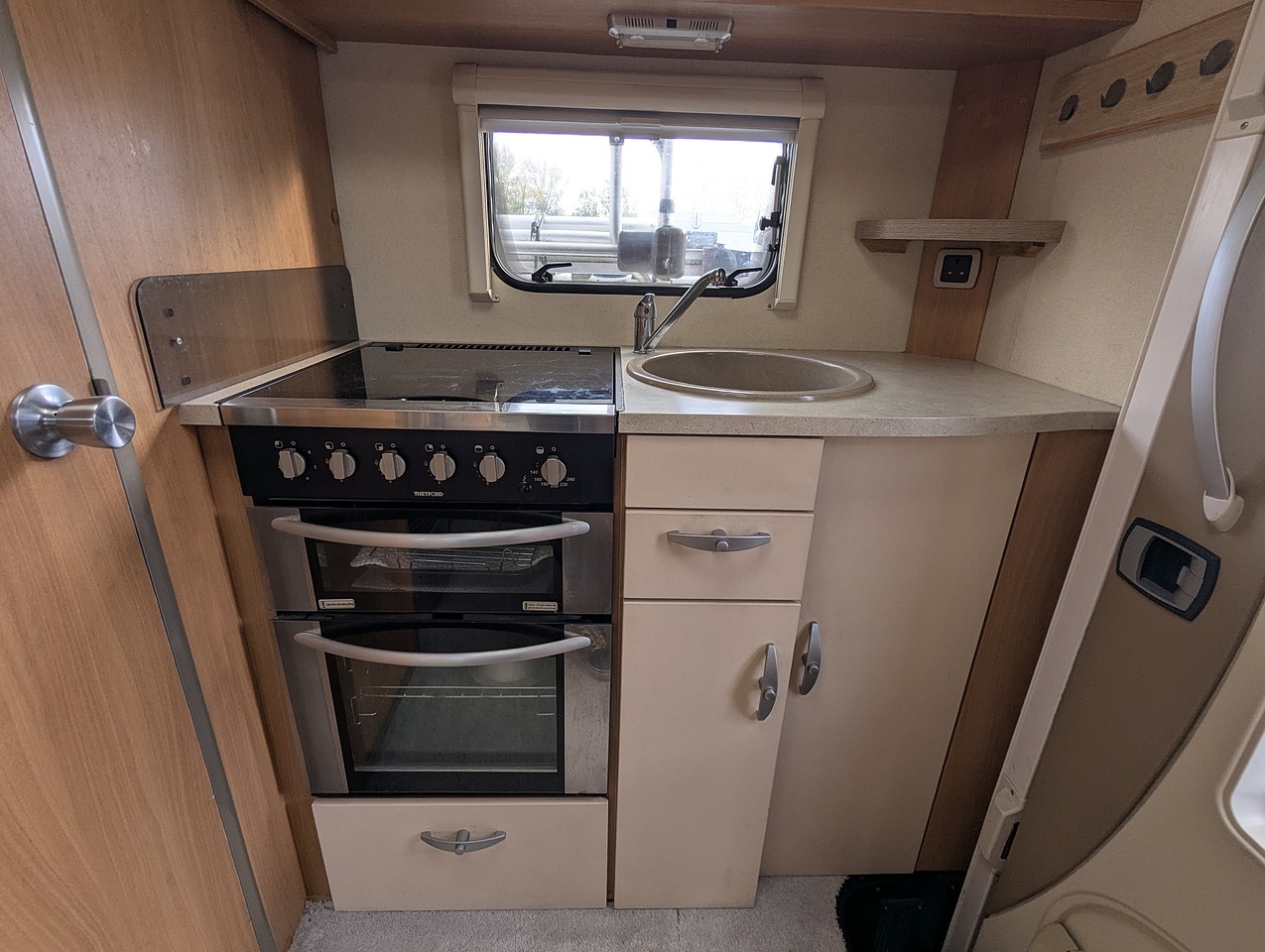 This model features an end kitchen layout, making cooking simple and practical, with a hob, oven/grill, sink, and fridge.