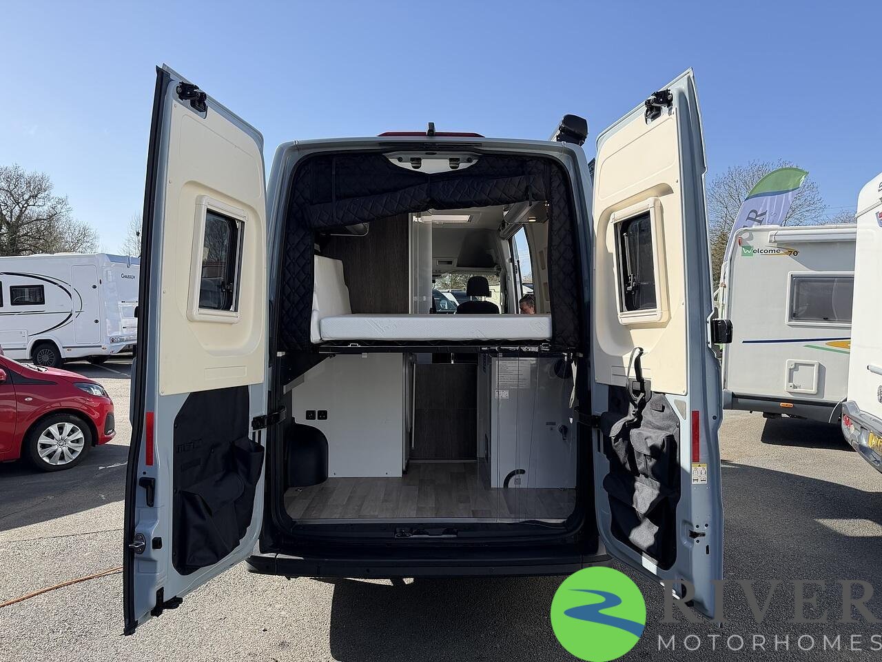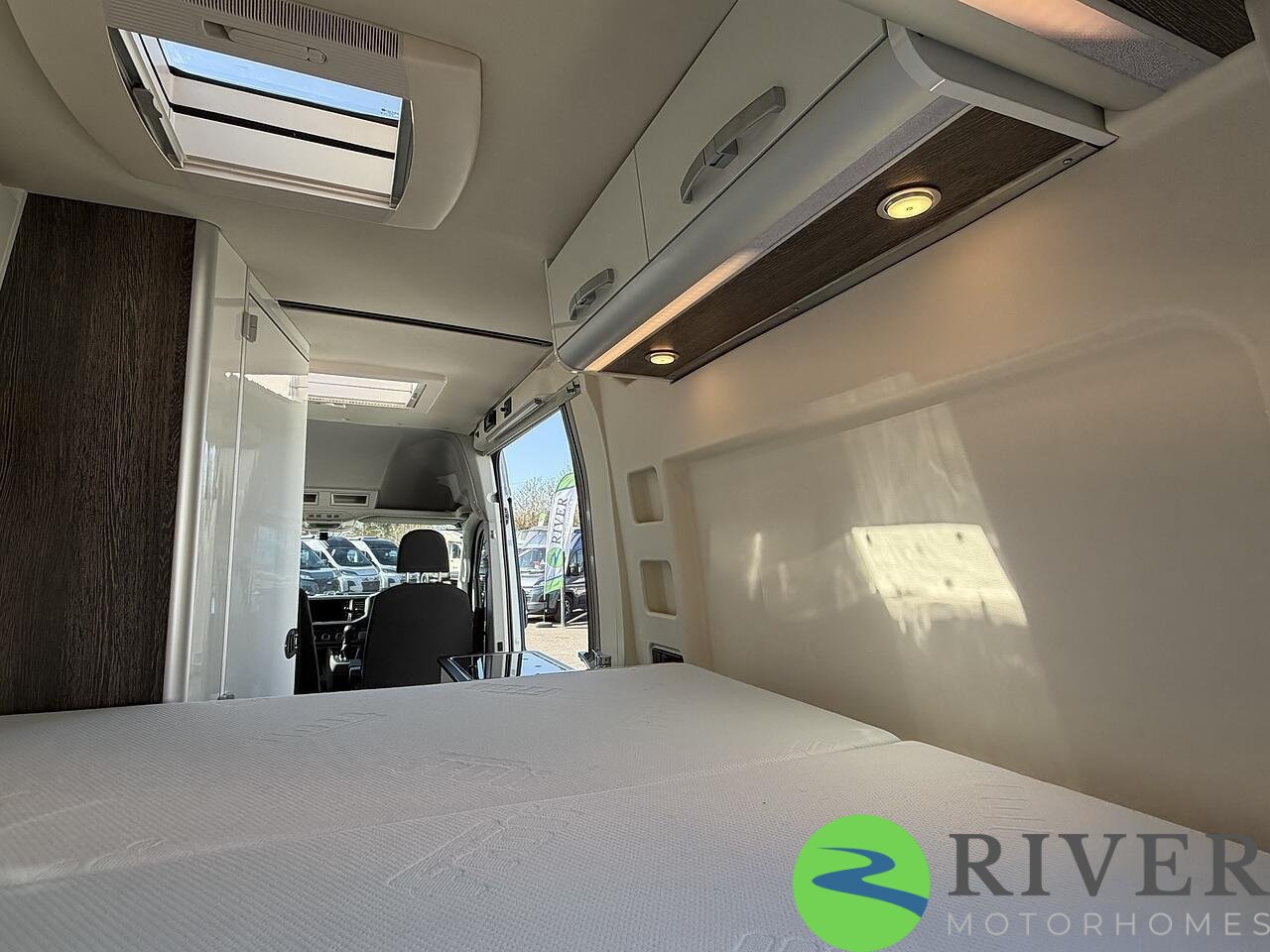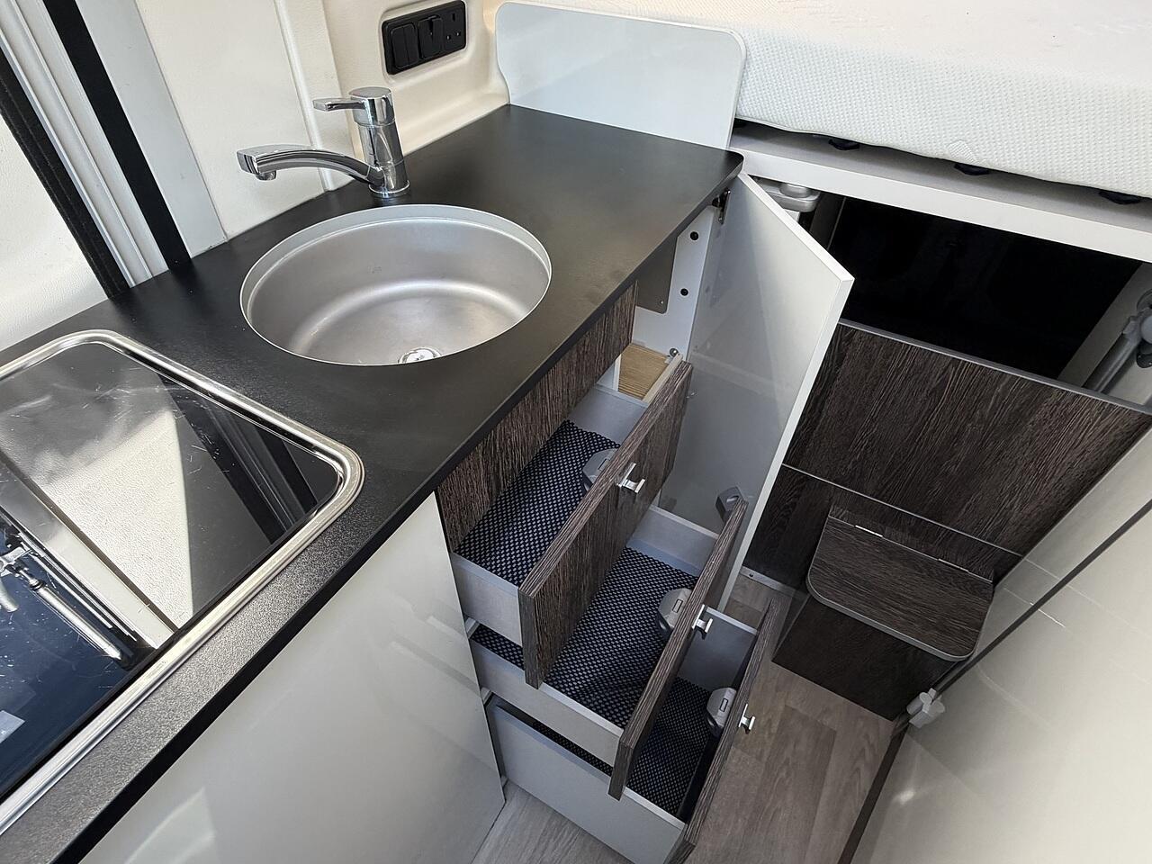 The sleeping area is generous and comfortable, perfect for extended trips, and there’s plenty of smart storage throughout to keep everything organised.