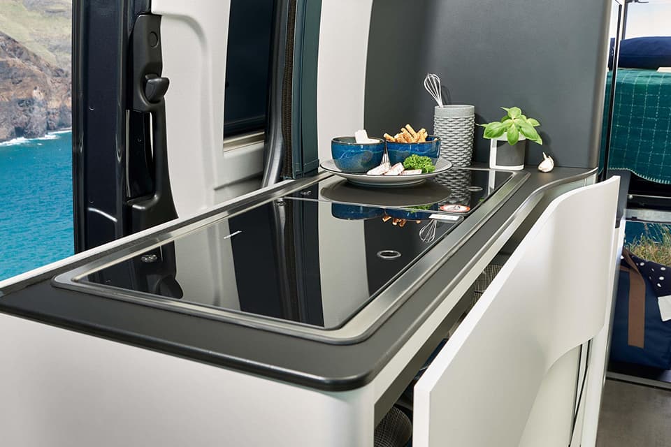 The Westfalia James Cook 600 E is an astonishing motorhome with an extended body and a rear slide-out that can accommodate an XXL bed. It’s perfect for couples who want to set off on an adventure in a top-of-the-range, fully-equipped van.