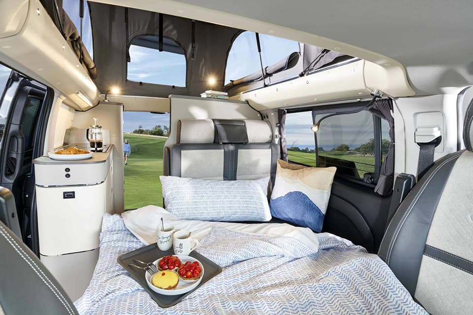 Inside this 4-seater camper van, everything is designed to maximise your comfort. With 4 berths, a pop-up roof, a chaise lounge with modular L-shaped benches, a private toilet area with WC and shower, and a fully-equipped top-of-the-range kitchenette with a large 51-litre fridge and hob, this model has everything you could want from a top-of-the-range van.